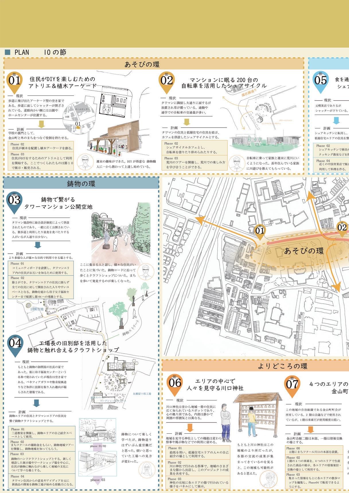 金山町を対象に、鋳物産業と共存してきた住工一致 の文脈を引き継ぎながら、新たな発想力を持つクリ エイターを受け入れて現在の技術の担い手とする提 案。鋳物工場のある都市空間の求心力と古来からの 相互扶助の仕組み「イッケ」に着目する。