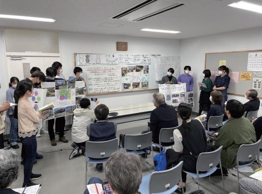 ——(1班)新しい住民の方との交流は、 休憩所に自転車のポートをつけることで 人が集まる仕掛けを作り、人がだんだん 集まるようになると考えている。