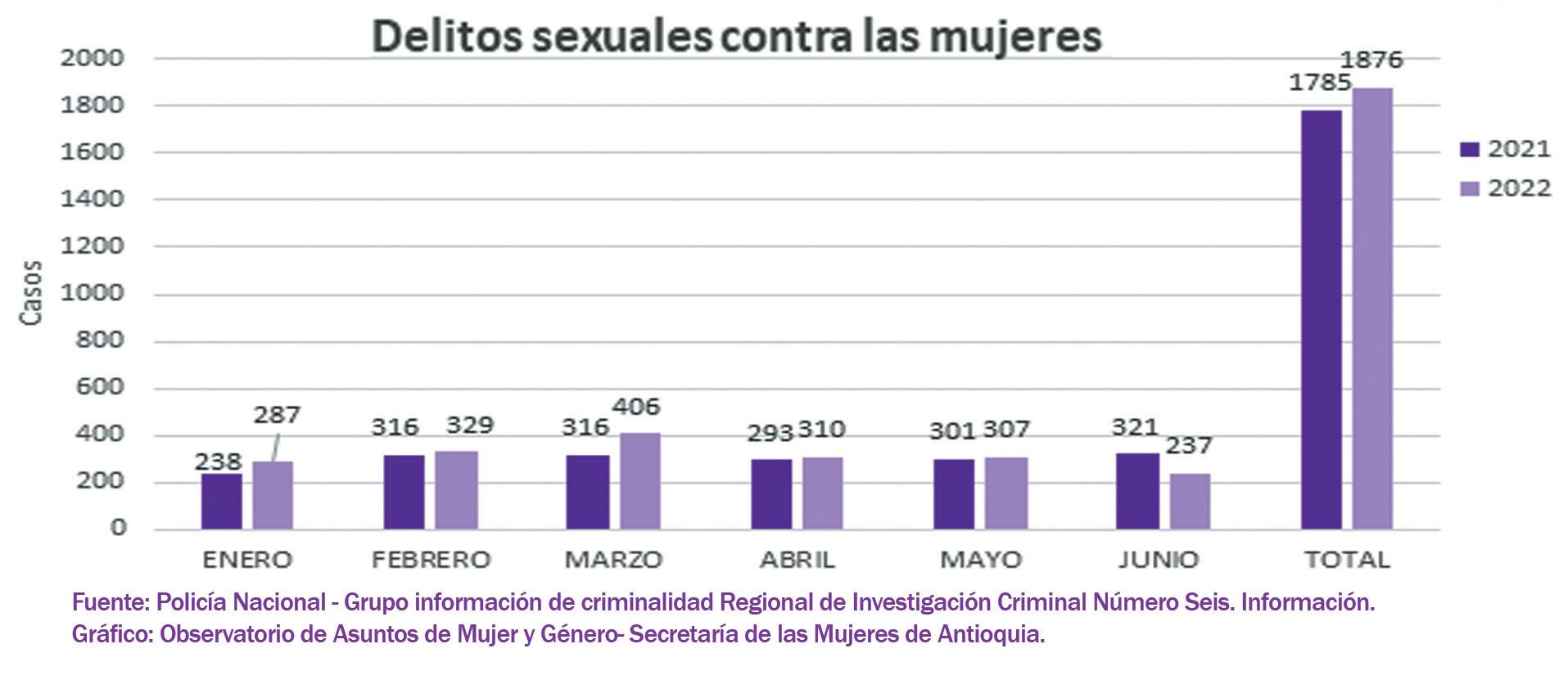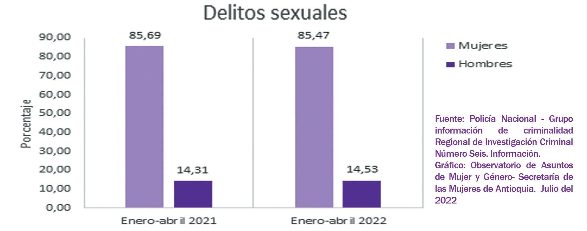 • Panorama sobre los Delitos sexuales En enero y junio de 2022 se registraron 2.217 casos de delitos sexuales, donde el 85% corresponden a víctimas del sexo femenino (1.876 mujeres). Con relación al 2021 se presentaron 134 casos más en los primeros 6 meses del año.