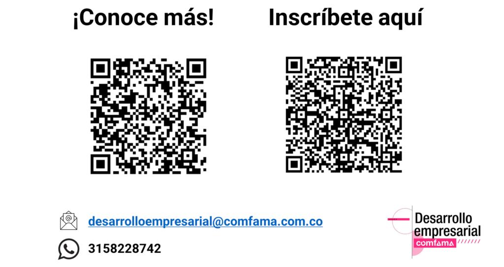 • Inscribirte es fácil, solo debes escanear el código QR, diligenciar el formulario de inscripción, anexar la documentación y enviarla al correo: desarrolloempresarial@ comfama.com.co. Al realizar esta acción se validarán los requisitos; posteriormente podrás acceder a la ruta seleccionada.