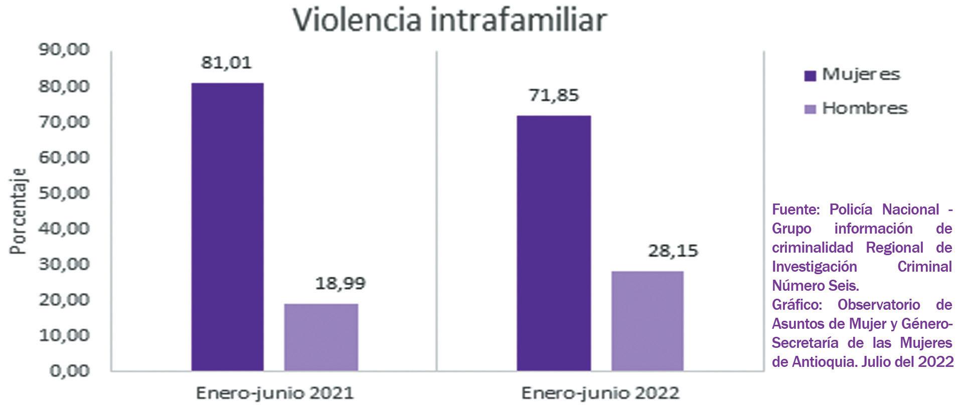 • Panorama de la violencia intrafamiliar En enero y junio del 2022 se registraron 8.302 casos de violencia intrafamiliar, el 70% de estos casos contra mujeres (5.861). En este mismo periodo para el 2021 se registraron 58.109 casos de los cuales 6.553 fueron contra mujeres (80%), esto significa que en 2022 se han registrado 692 casos menos de violencia intrafamiliar contra las mujeres que en el 2021 en lo correspondiente al primer semestre. La subregión con más casos de violencia intrafamiliar reportados fue Valle de Aburrá con 6.838 casos, seguido de Oriente con 370 casos, mientras que en Urabá se reportaron 290 casos.