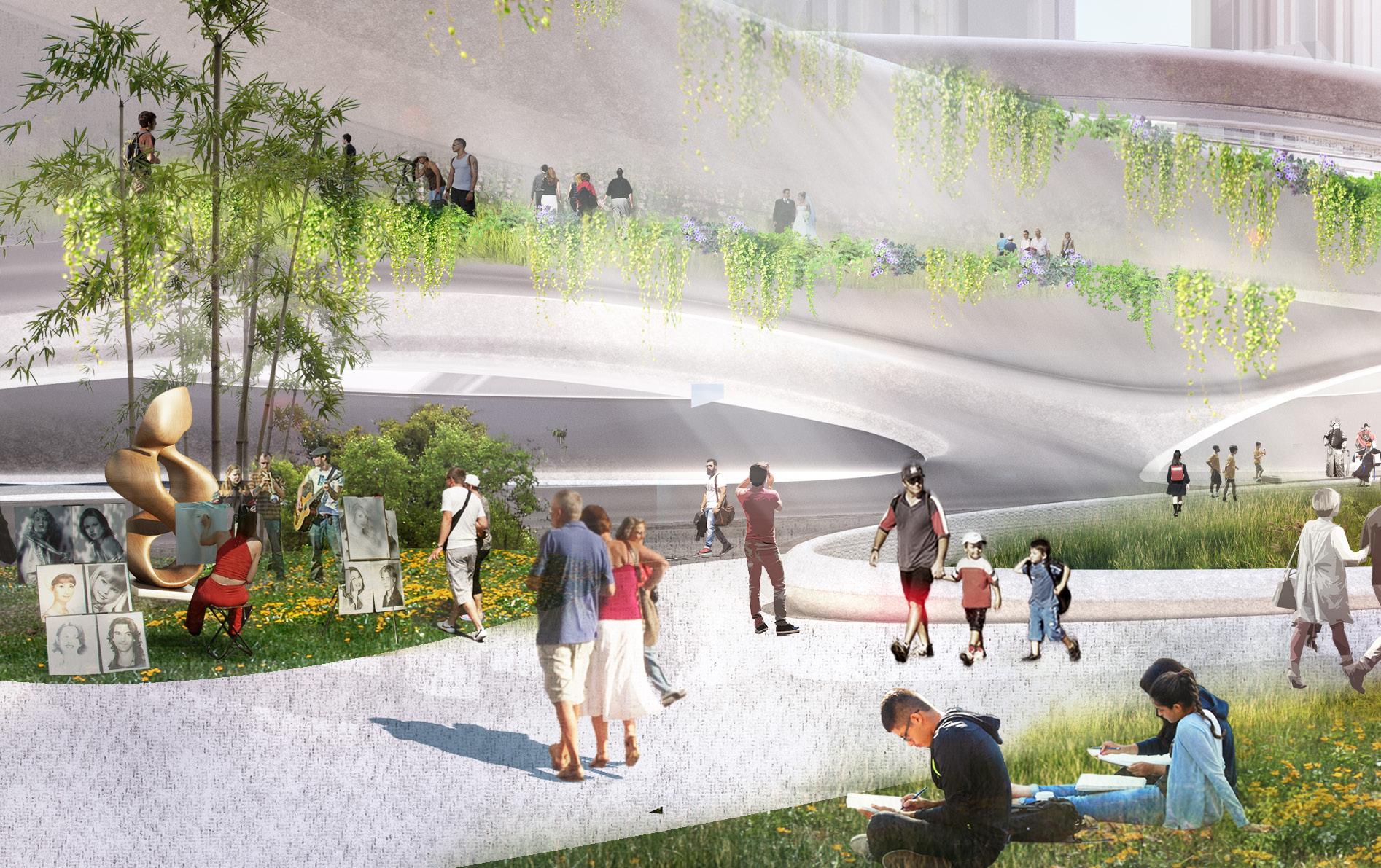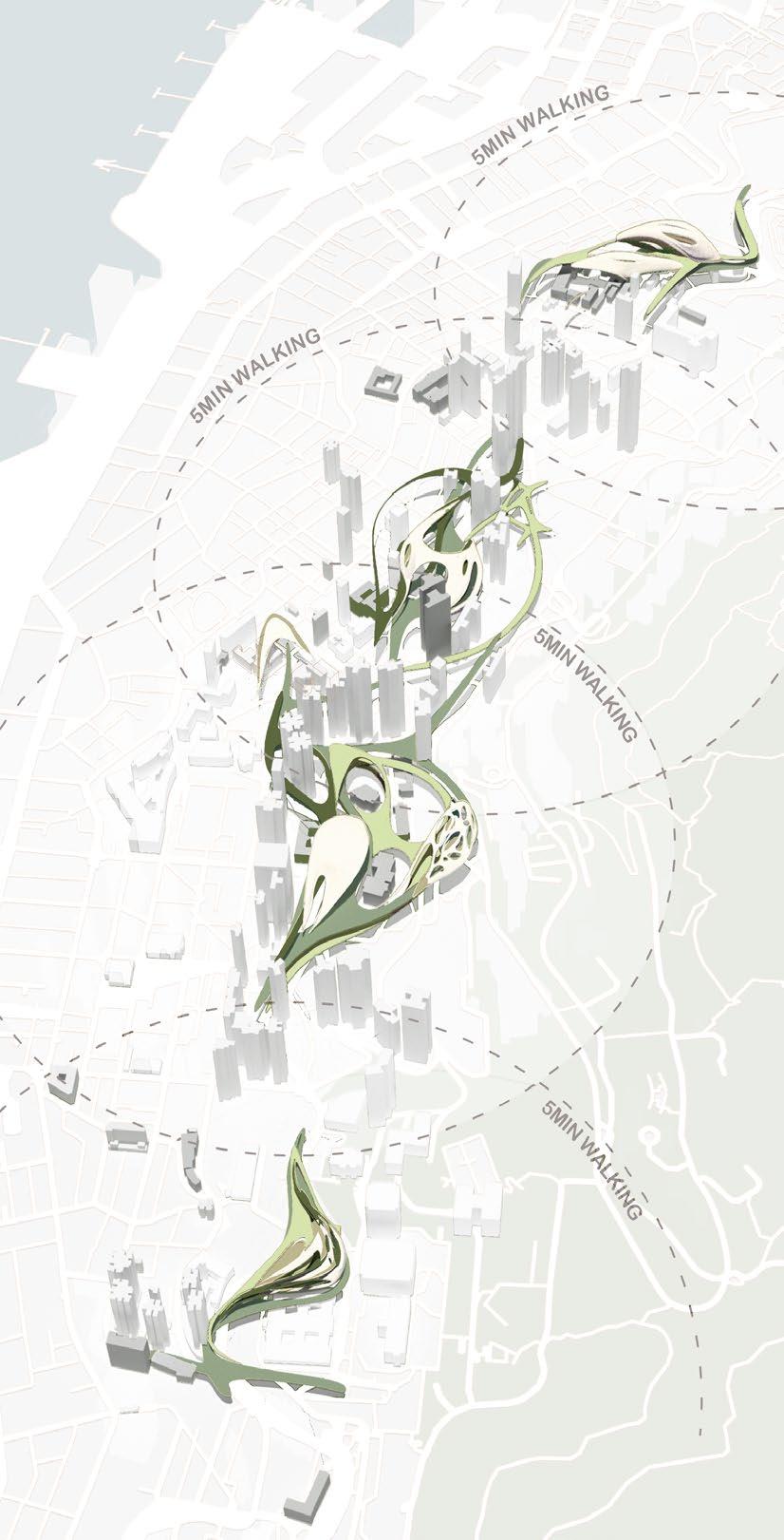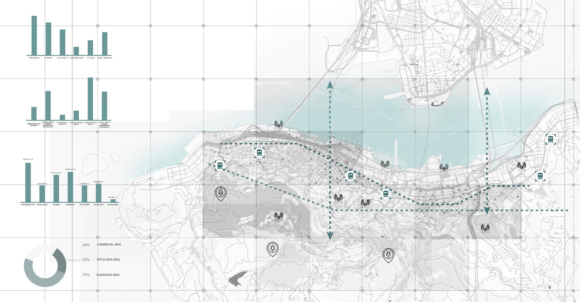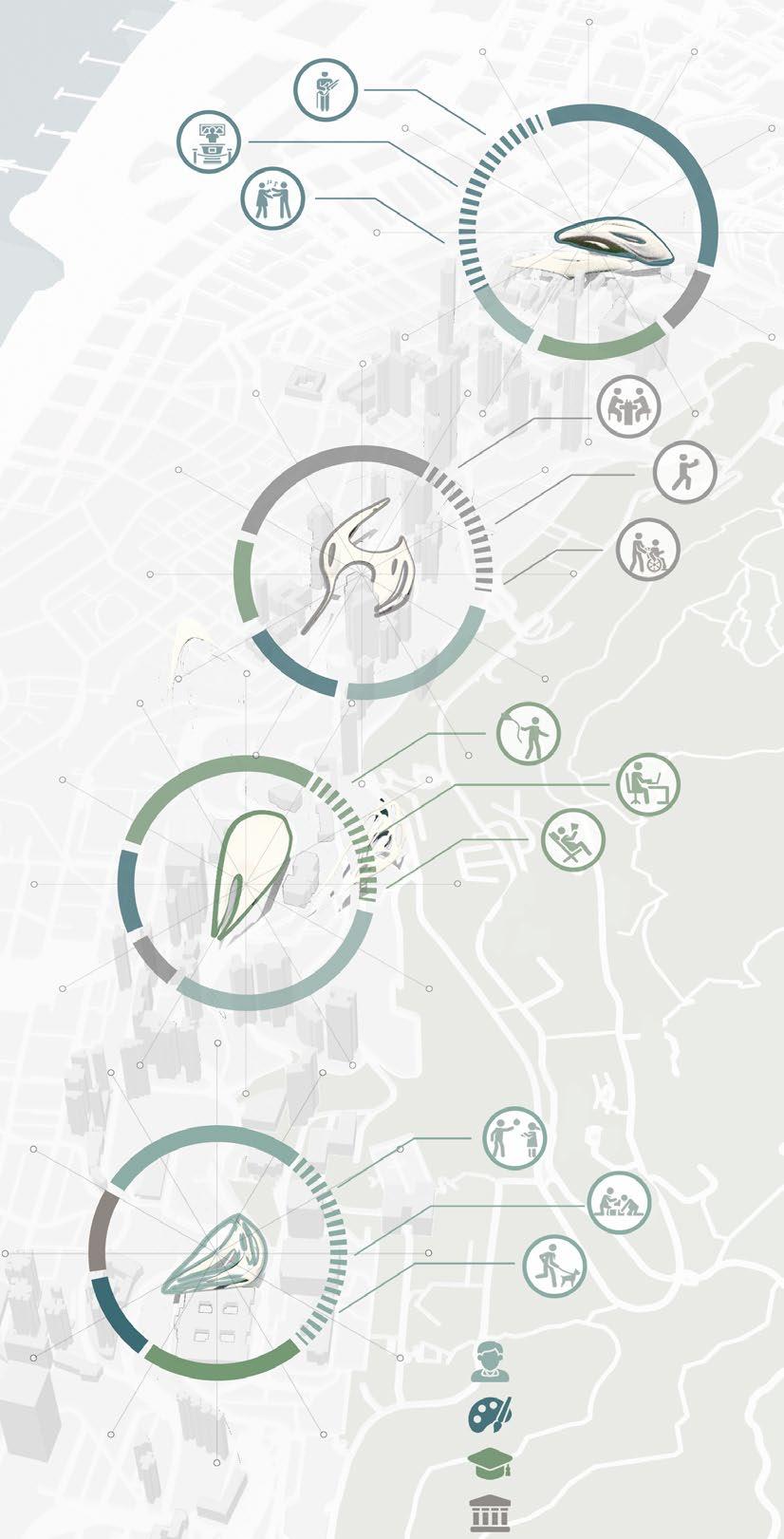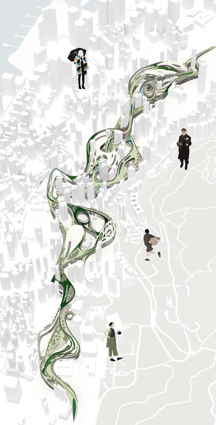 A concept for a continuous corridor is offered to foster a more engaging and healthful urban environment based on the urban fabric. It formulates a comprehensive strategy for a sustainable urban framework, developing new culturally relevant infrastructure across the Central and Western Districts of Hong Kong. An extensive metropolitan structure was established by integrating three distinct rotations among four prominent strongholds. The initiative seeks to provide services for inhabitants of all ages, propose a viable solution for balancing land use and public spaces, and motivate individuals to reassess their lifestyles and their connection with the community.