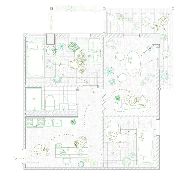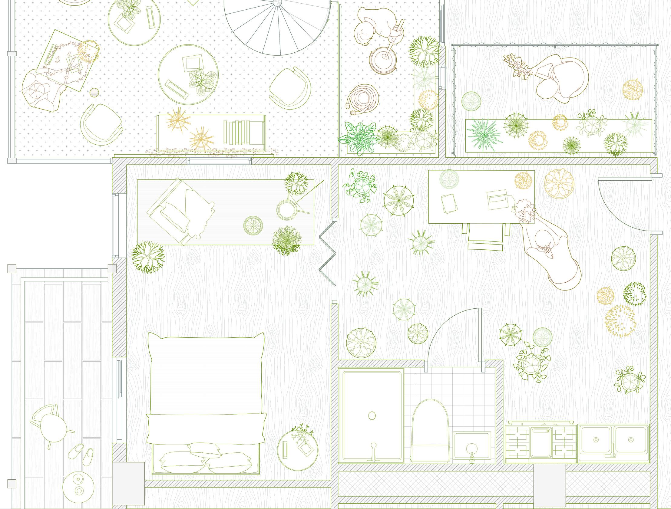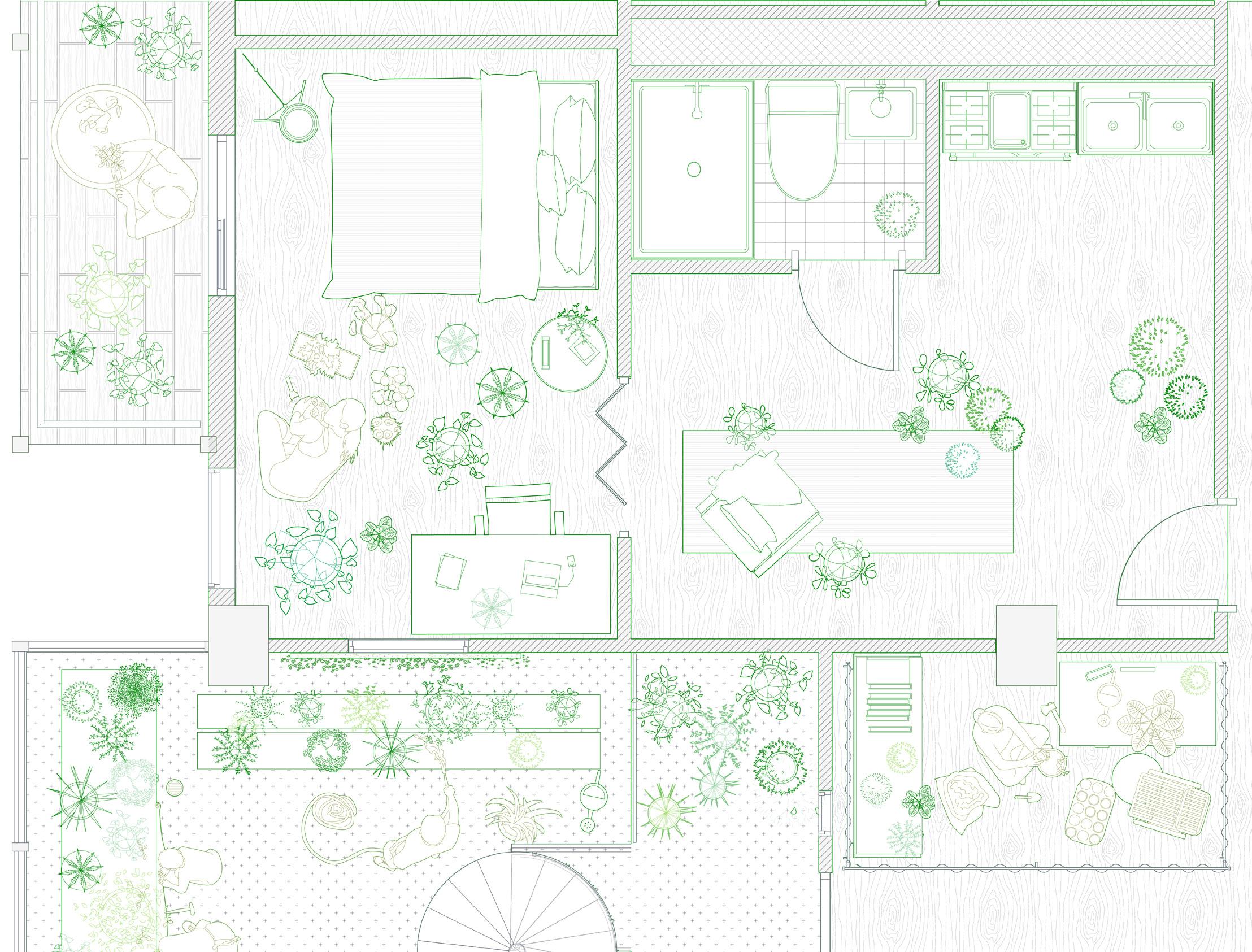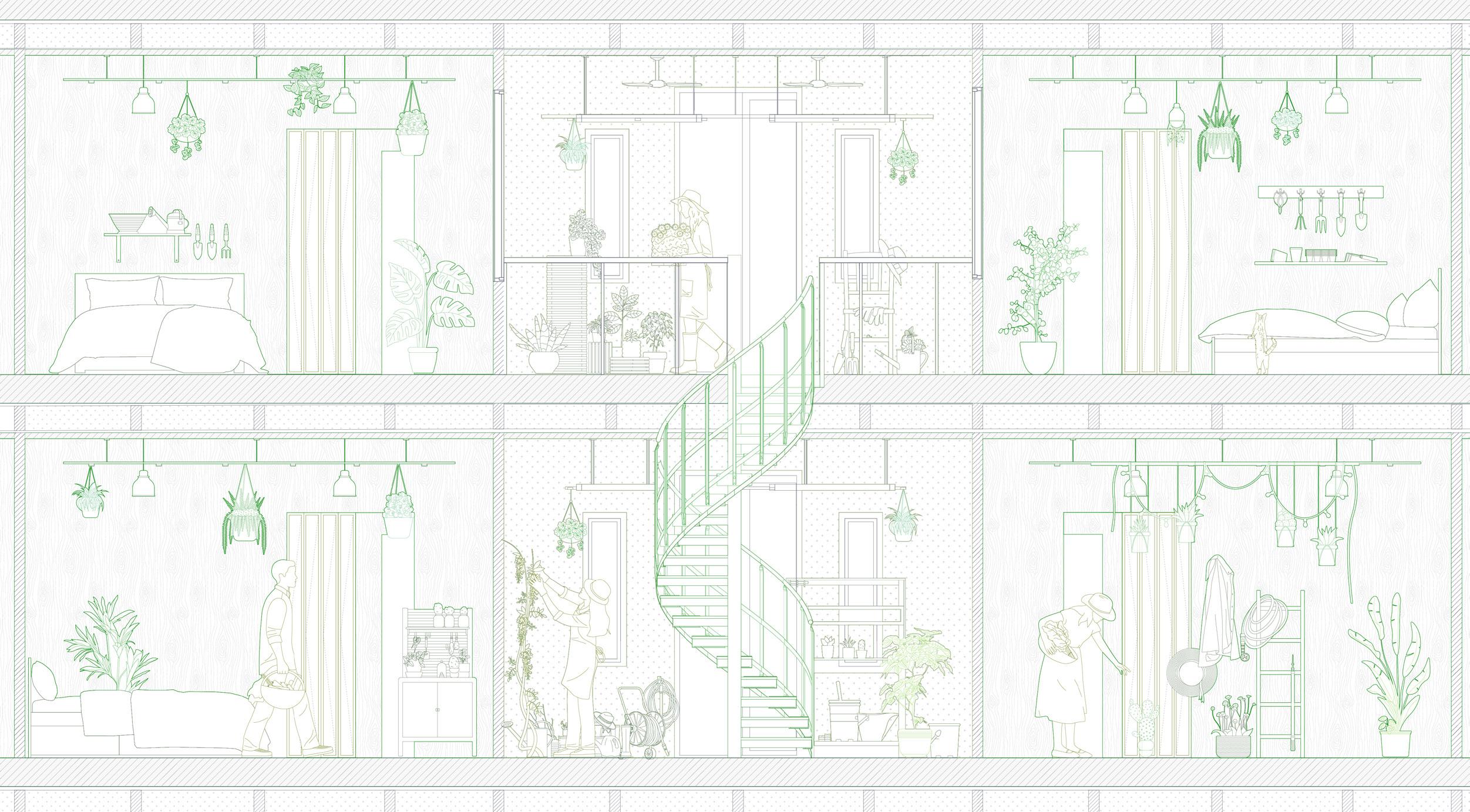 Garden has been created by human actions, nevertheless the life of plants have a far deeper history than human existence. First the plants grow on the earth, then the human start to interact with them for food, and the technology starts allowing the us to grow plants we want around the housing, garden has been introduced as a private land identification, then the city grow, the urban structure starts to forming public gardening and the towers drag people away from the greens. In this project, we attempted to reestablish the interaction between plant and human existence, presenting a dwelling design based on seasonal shifting and climate.
