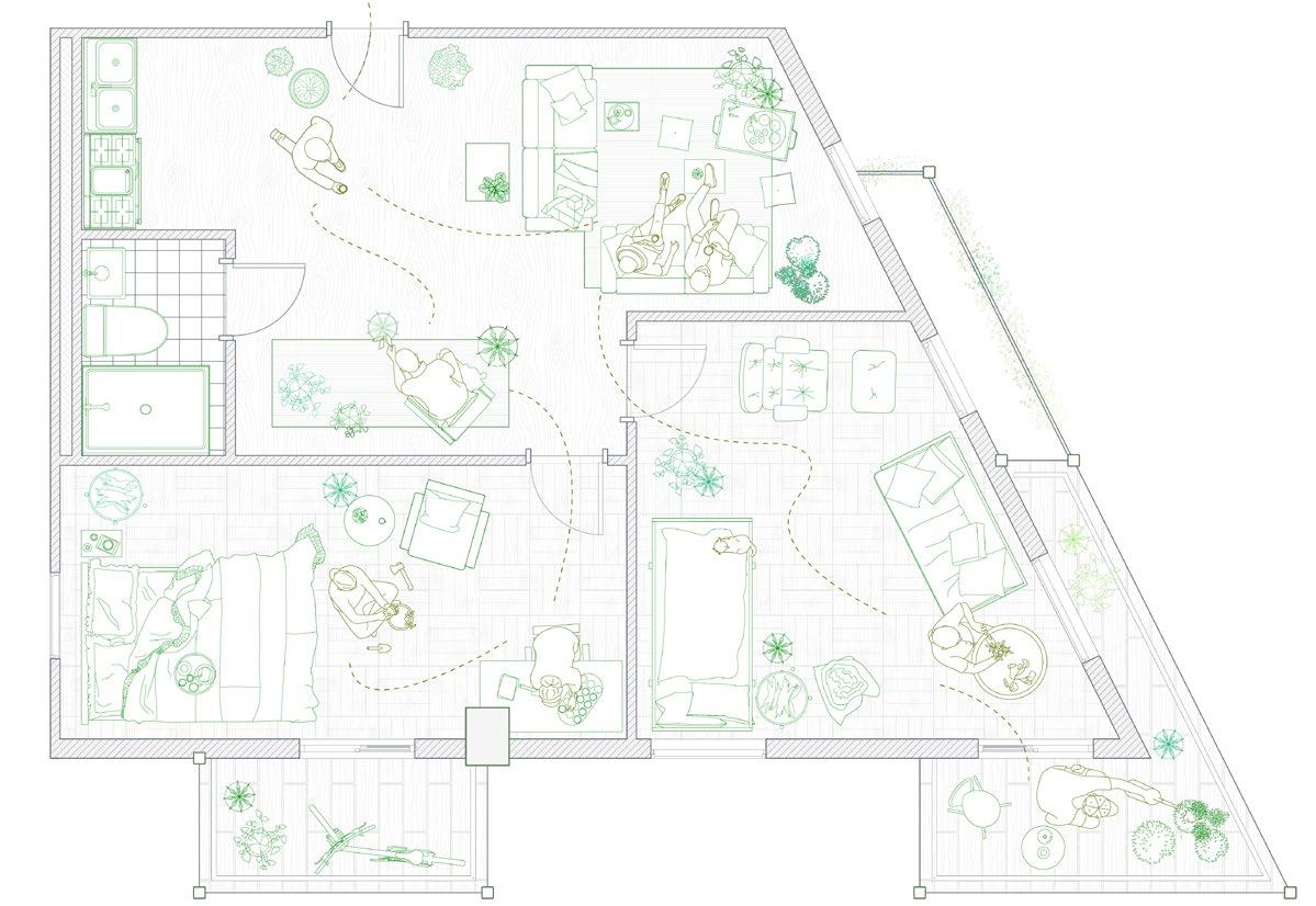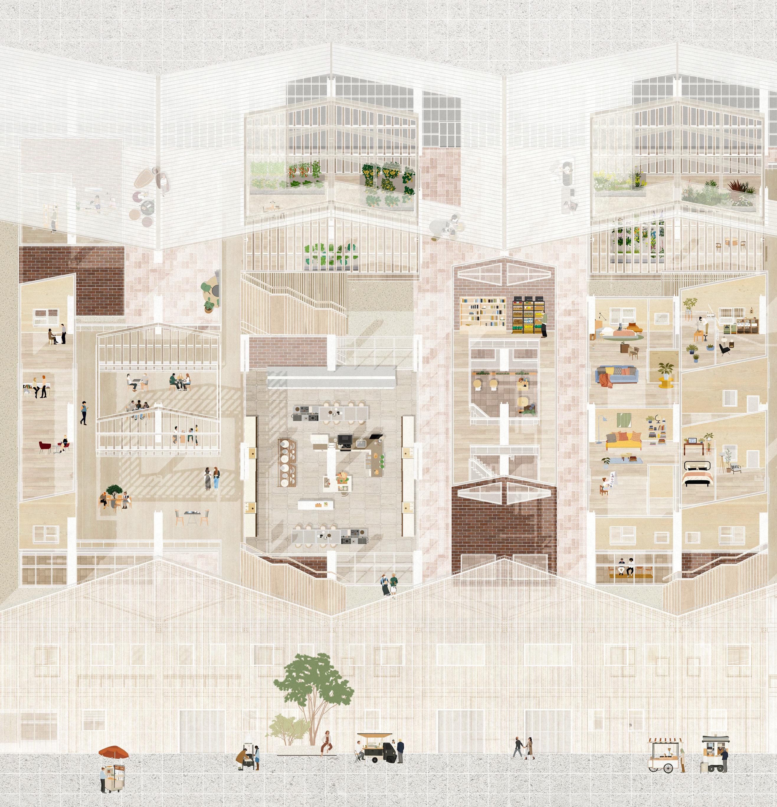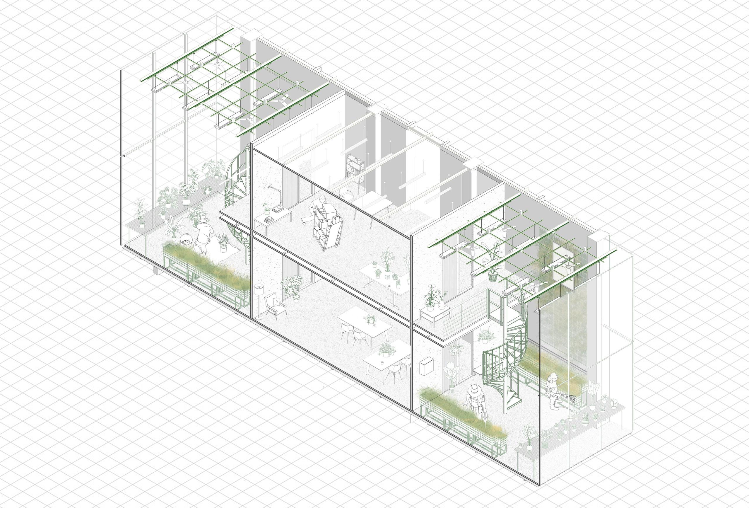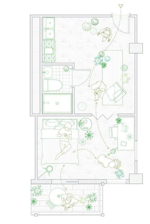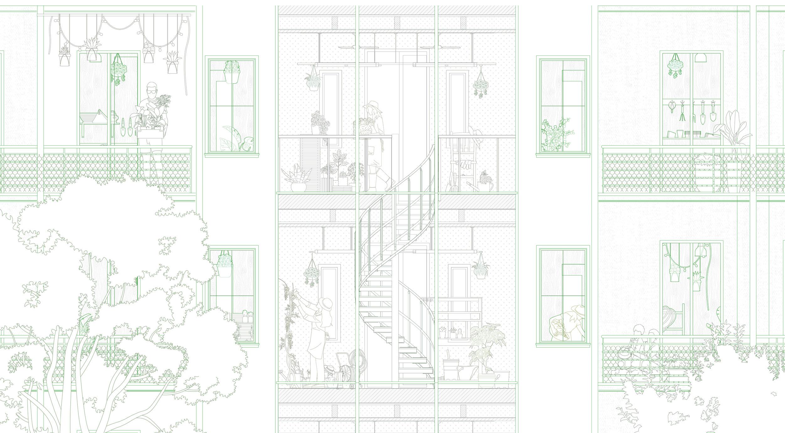 Garden has been created by human actions, nevertheless the life of plants have a far deeper history than human existence. First the plants grow on the earth, then the human start to interact with them for food, and the technology starts allowing the us to grow plants we want around the housing, garden has been introduced as a private land identification, then the city grow, the urban structure starts to forming public gardening and the towers drag people away from the greens. In this project, we attempted to reestablish the interaction between plant and human existence, presenting a dwelling design based on seasonal shifting and climate.