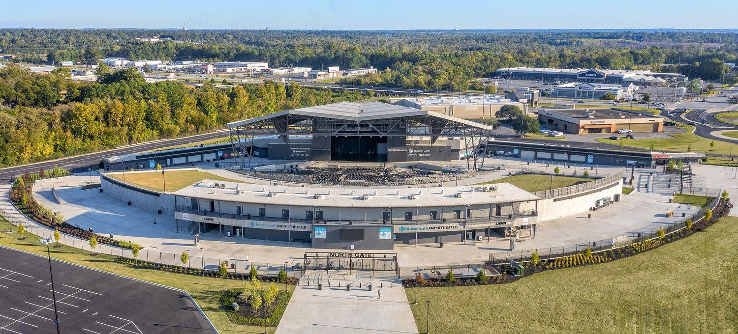 amphitheater stage is located in the southeast corner of the campus, oriented towards Rocky Creek and Mercer UniversiThe venue has three separate seating sections: 2,500 permanent seats in a tiered seating bowl, 1,500 temporary seats on a flat floor situatbetween the fixed seats and the stage, and 6,000 grass seats located outside the bowl and roof structure. VIP seating consists of 10 ‘boxes’ located bepit and the permanent seats. Two entry plazas have concessions, retail facilities, and bathrooms, along with views that offer supplementary VIP options. concession and retail alternatives will be available near the amphitheater, and prospective plans may include the establishment of a full-service restaurant.
