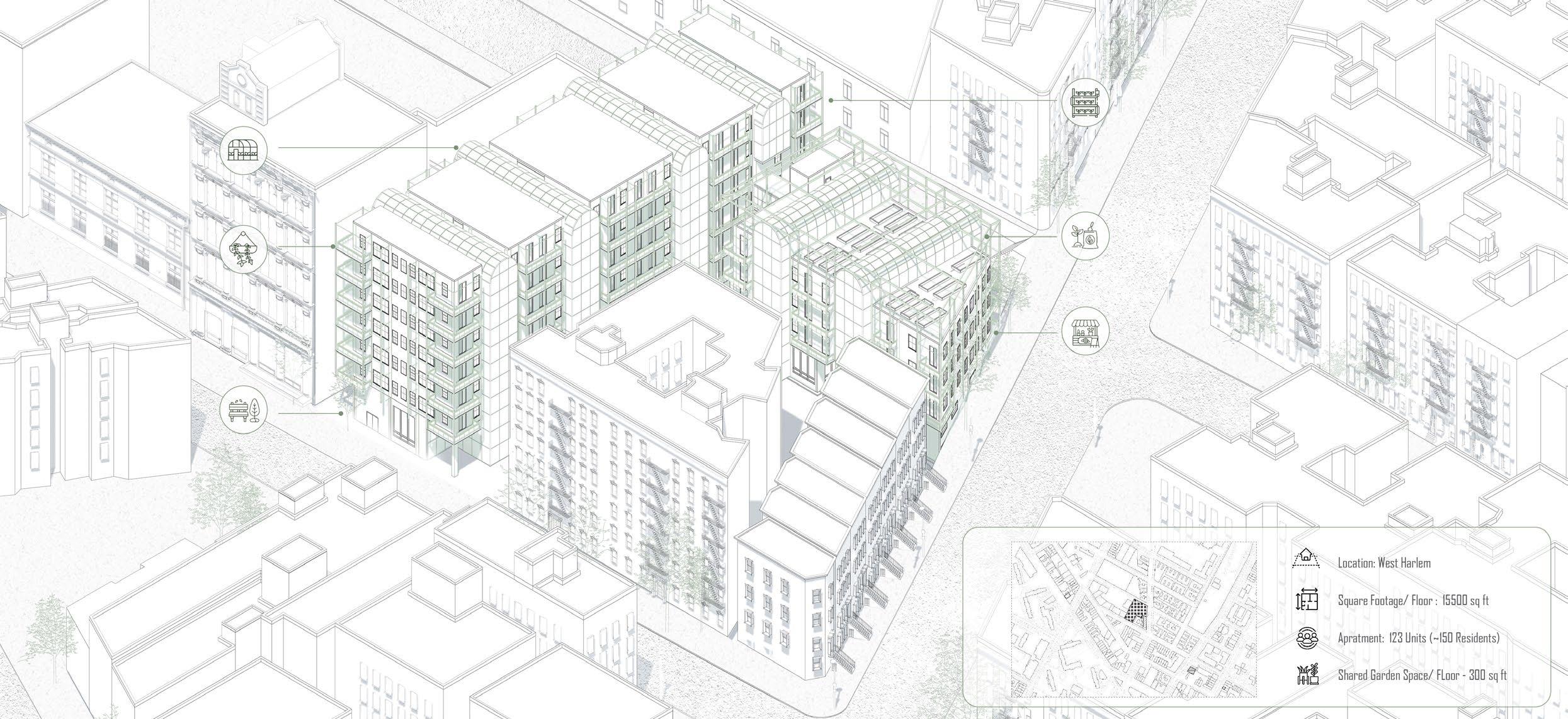 The researcher examines the perspective of housing in New York City,the historical context of small units, and the impact of legislation on livingstandards in megacities. Examines the interplay between humans and plants, emphasizing the need of a healthy lifestyle and the urban housing crisis. The pricing, maintenance, and design must be integrated not just asa solution to the housing crisis but also to foster a community for the future.