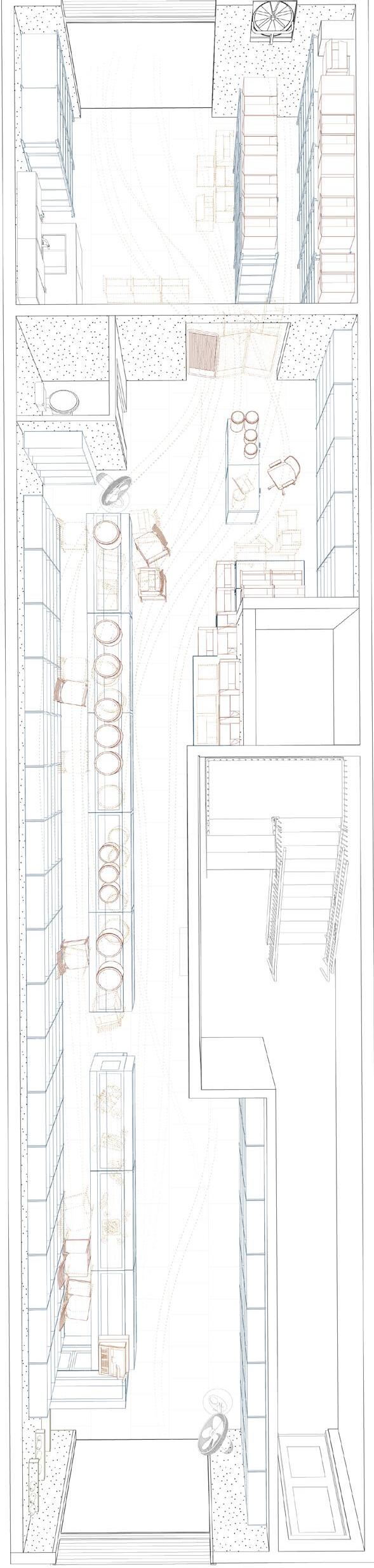 The Eastern Herb Store exemplifies an anti-typological approach, rejecting the rigid Western pharmacy model. The elongated ground floor is divided by shelves and curtains rather than walls, and dietary therapy.