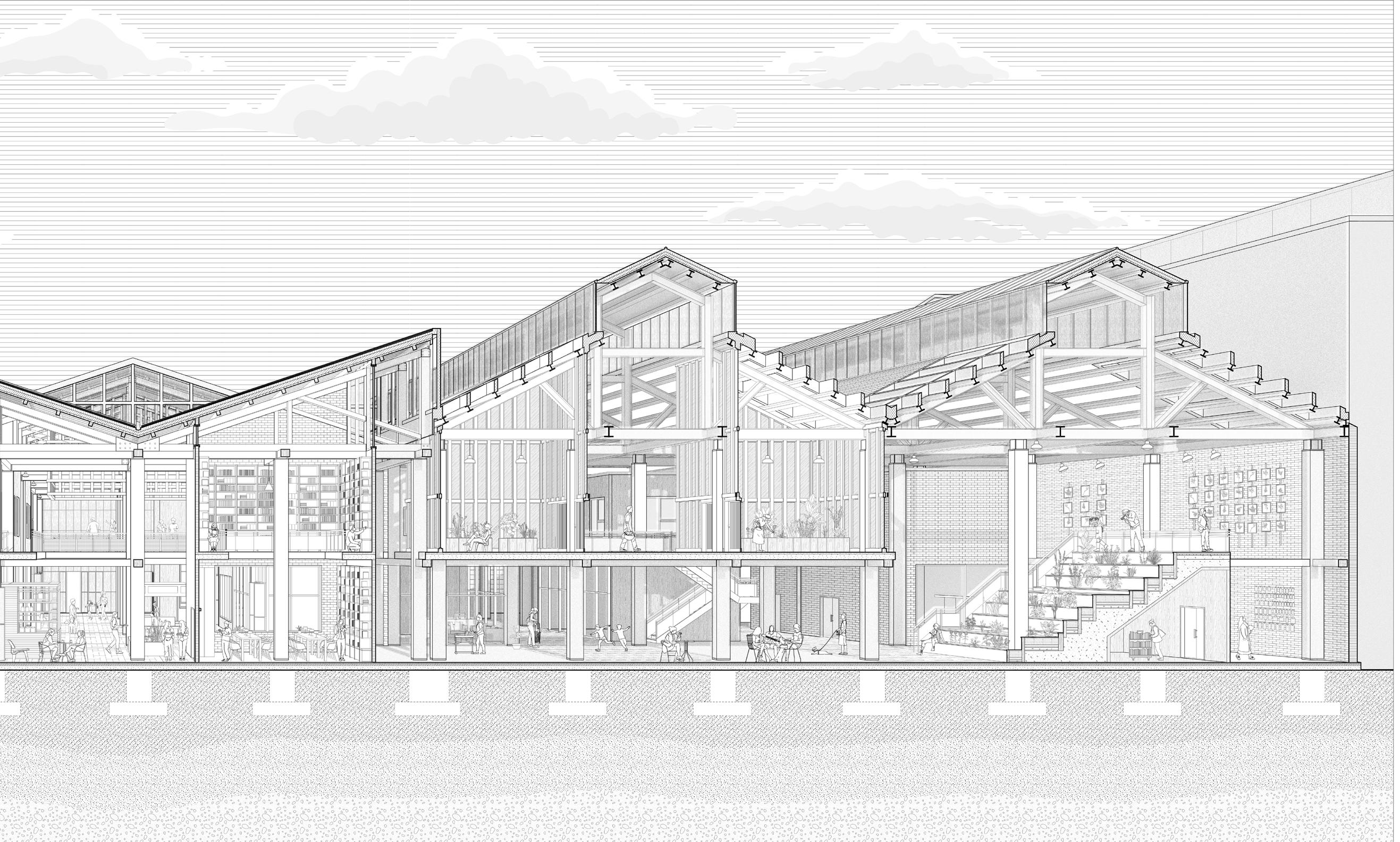 The design framework is organized through an interlaced system of herb planting cores, community cores, and knowledge cores. These cores are distributed across the existing steel and brick structures to produce a continuous spatial network rather than isolated programmatic zones.