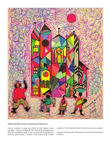 Exhibit and Silent Auction of paintings by Aldo Parisot You are welcome to enjoy the exhibit of Aldo Parisot’s recent paintings, which are available for sale. A list of the paintings and a price list is available on stage. If you are interested in purchasing a painting, please notify a member of the concert staff. Checks,