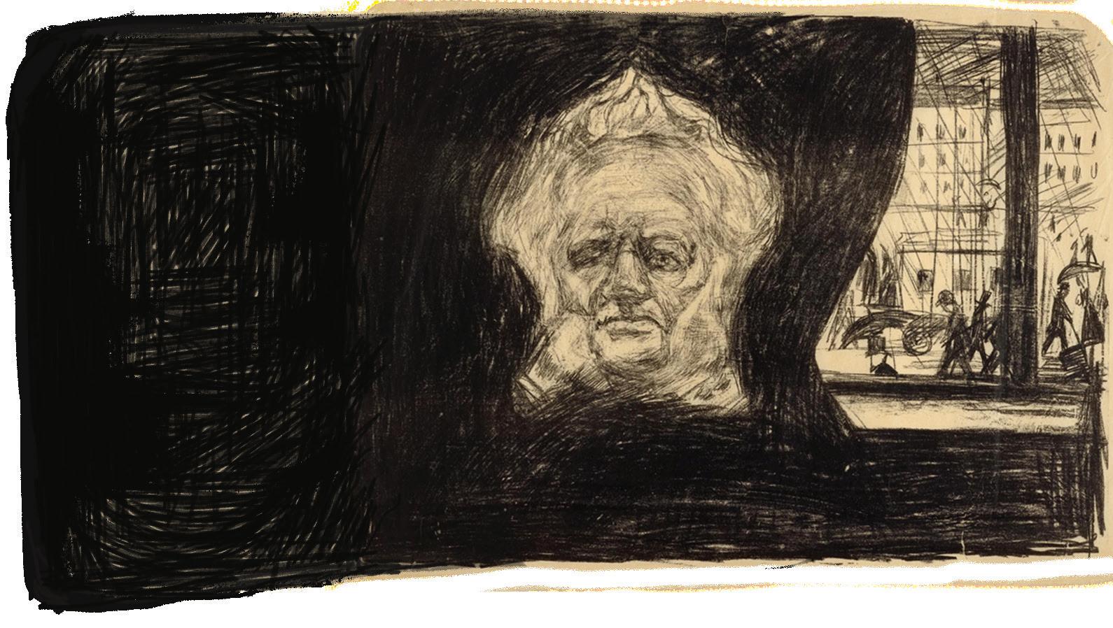 ARRIBA: IBSEN EN EL CAFÉ DEL GRAND HOTEL, CHRISTIANIA, EDVARD MUNCH, 1902.