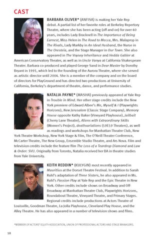 CAST BARBARA OLIVER* (ANFISA) is making her Yale Rep debut. A partial list of her favorite roles at Berkeley Repertory Theatre, where she has been acting (off and on) for over 40 years, includes Lady Bracknell in The Importance of Being Earnest, Miss Helen in The Road to Mecca, Mrs. Malaprop in The Rivals, Lady Markby in An Ideal Husband, the Nurse in The Oresteia, and the Stage Manager in Our Town. She also appeared in The Voysey Inheritance and Hedda Gabler at American Conservatory Theater, as well as in Uncle Vanya at California Shakespeare Theater. Barbara co-produced and played George Sand in Dear Master by Dorothy Bryant in 1991, which led to the founding of the Aurora Theatre, where she served as artistic director until 2004. She is a member of the company and on the board of directors for PlayGround and has directed two productions at University of California, Berkeley’s department of theatre, dance, and performance studies.