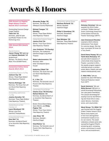 59th Annual Obie Awards 2014 Special Citations Jiyoun Chang ’08 (lighting) and Hannah Wasileski ’13 (projections) Winners, The World is Round (Ripe Time @ BAM Fisher) Connecticut Critics Circle Awards 2013–2014 Outstanding Director of a Play Jackson Gay ’02 Winner, These Paper Bullets! (Yale Repertory Theatre) Patricia McGregor ’09 Nominee, The House that will not Stand (Yale Repertory Theatre) Outstanding Lead Actress in a Play Jeanine Serralles ’02 Nominee, These Paper Bullets! (Yale Repertory Theatre) Outstanding Ensemble (member of) Laura Woodward ’09 Winner, Love/Sick (Hartford TheaterWorks) Outstanding Set Design Kate Noll ’14 Nominee, Accidental Death of an Anarchist (Yale Repertory Theatre)