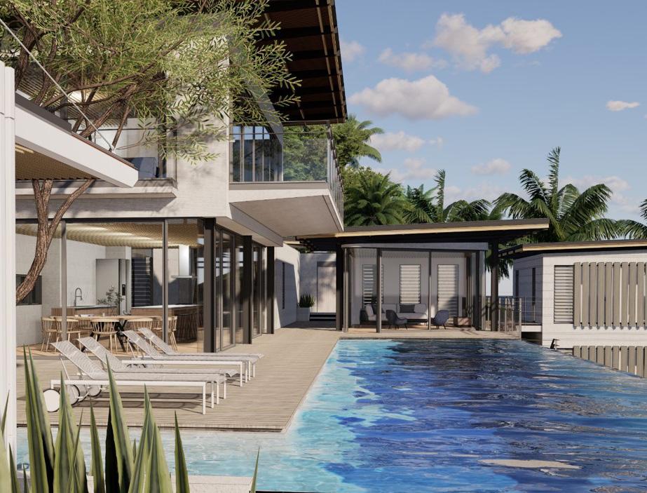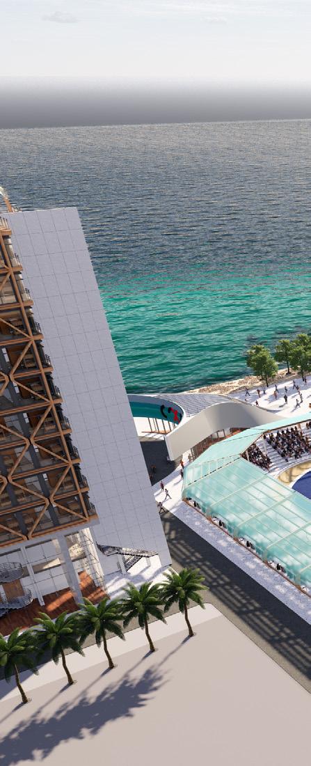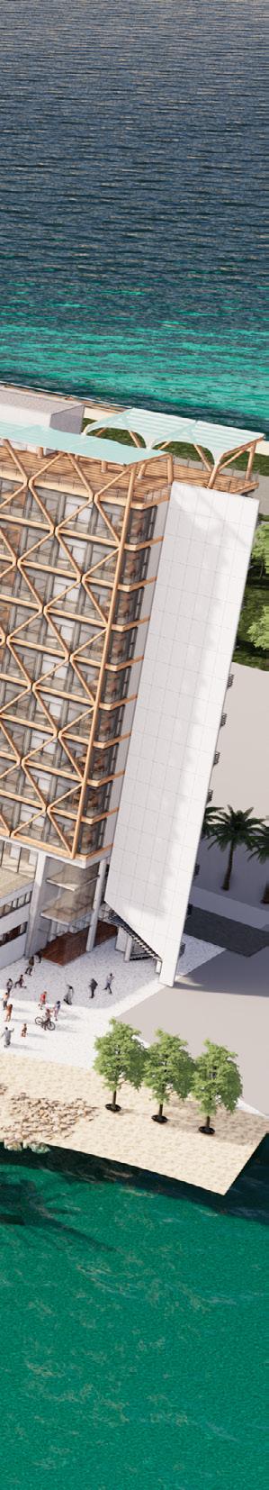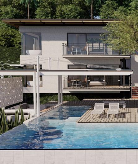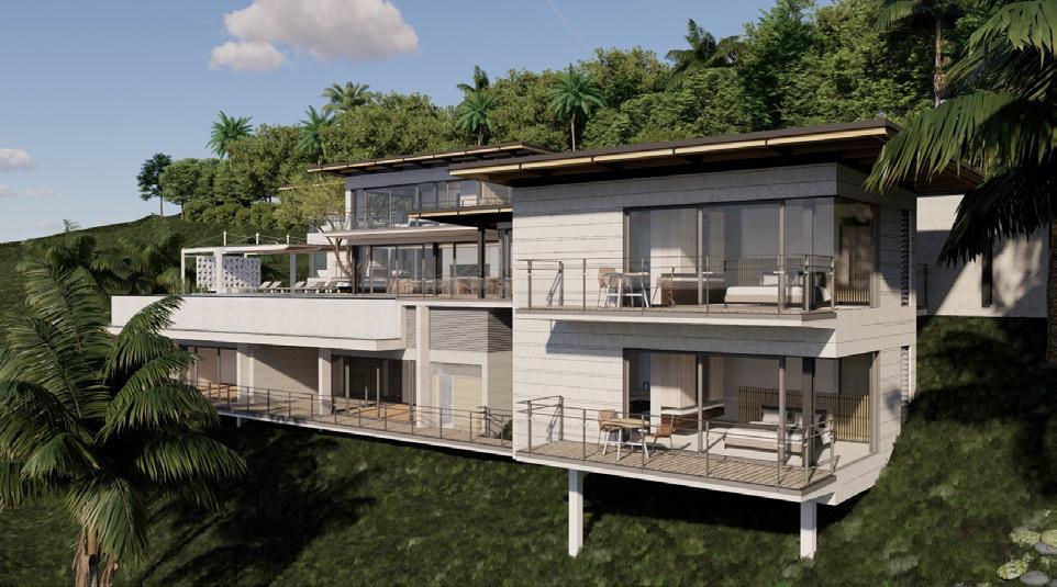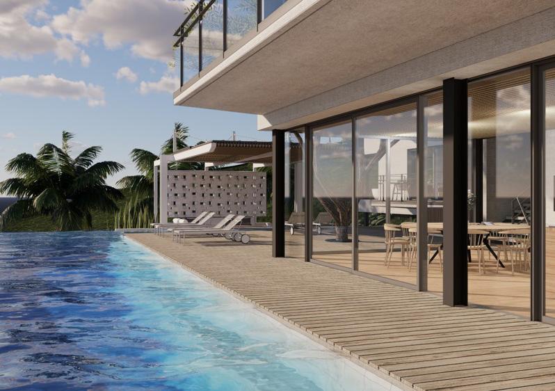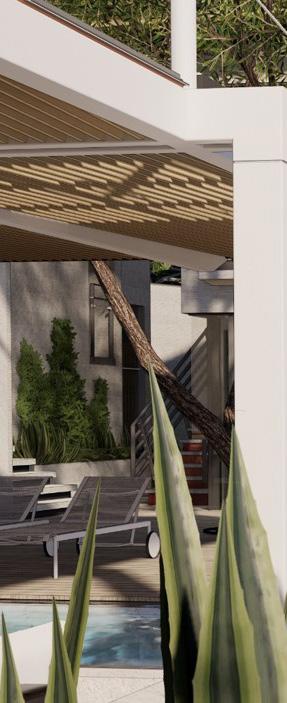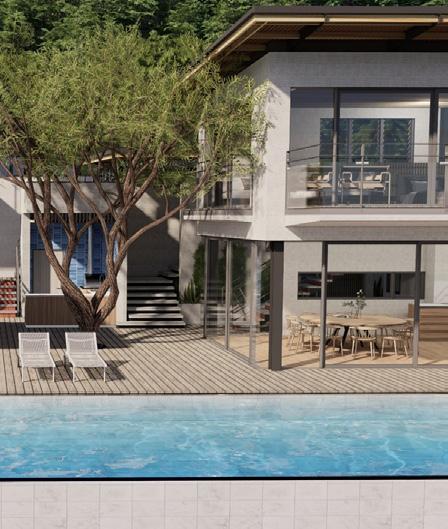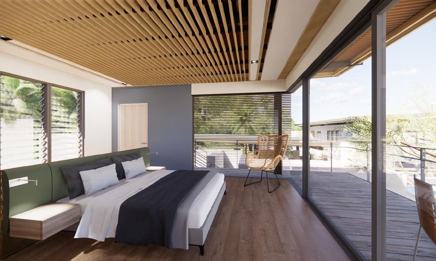 The buildings are designed to be climate-appropriate, with large overhanging and highly insulated roofs providing shade to the buildings and deck areas, a low-carbon-footprint steel-frame superstructure, solar heating to the pool, fanassisted climate controls, and LED lighting throughout the development.