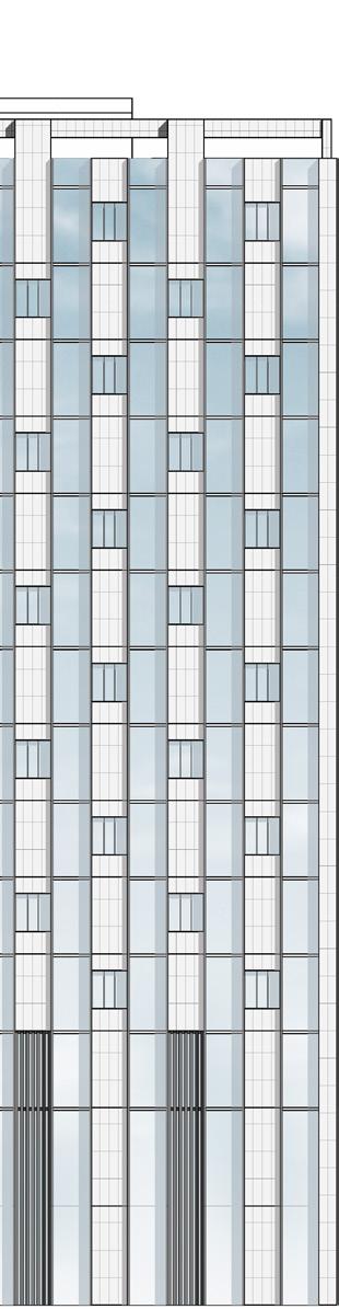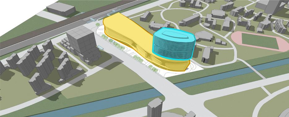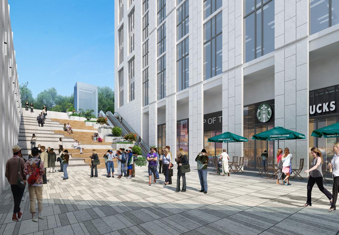 Shape of podium is accentuated with curvature to form a pronounced commercial interface