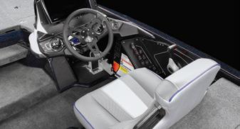 Driver-focused helm features a gimbal mount Humminbird® Helix® 12, racing style steering wheel, multi-functional gauges, classic rocker switches, and a Hot Foot™ with Pro Trim.