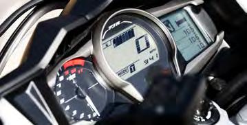The twin 3.5in multi-function TFT meters display extremely clear data and feature an intuitive rider interface that separates the critical running information from the functional operational information. Key running information is featured on the left screen, including a multi-coloured bar-type tachometer whose colour changes as rpm rises, as well as a digital speedometer, fuel gauge, gear position and TCS mode indicator. Meanwhile the right screen is split into four separate sections, each one displaying a range of information such as odometer, tripmeters 1 & 2, temperature and more.