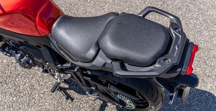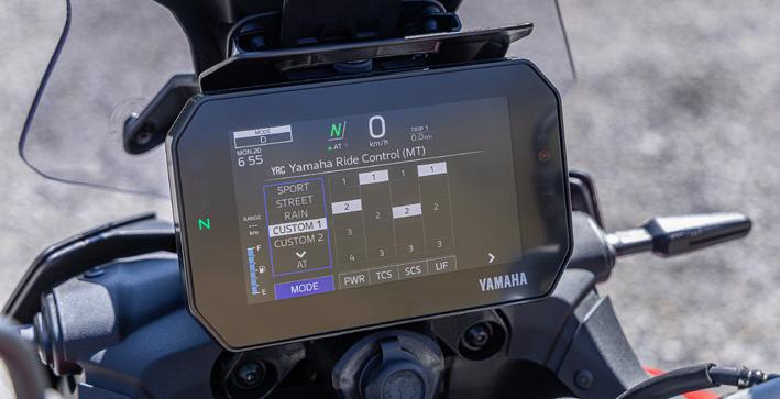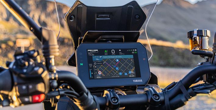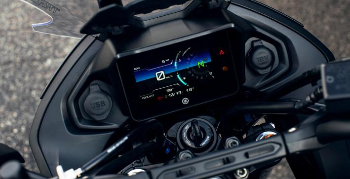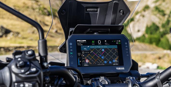 7” TFT har tre temaer og leveres med Garmin Motorize-tilslutningsmuligheder for at give integreret navigation, mens samtaler, beskeder og musik kan modtages via Yamaha MyRideappen og styres ved hjælp af 5-vejs joysticket på venstre kontaktenhed. Et dedikeret integreret opbevaringsrum inkluderer et USB-A-strømudtag til opladning på farten.