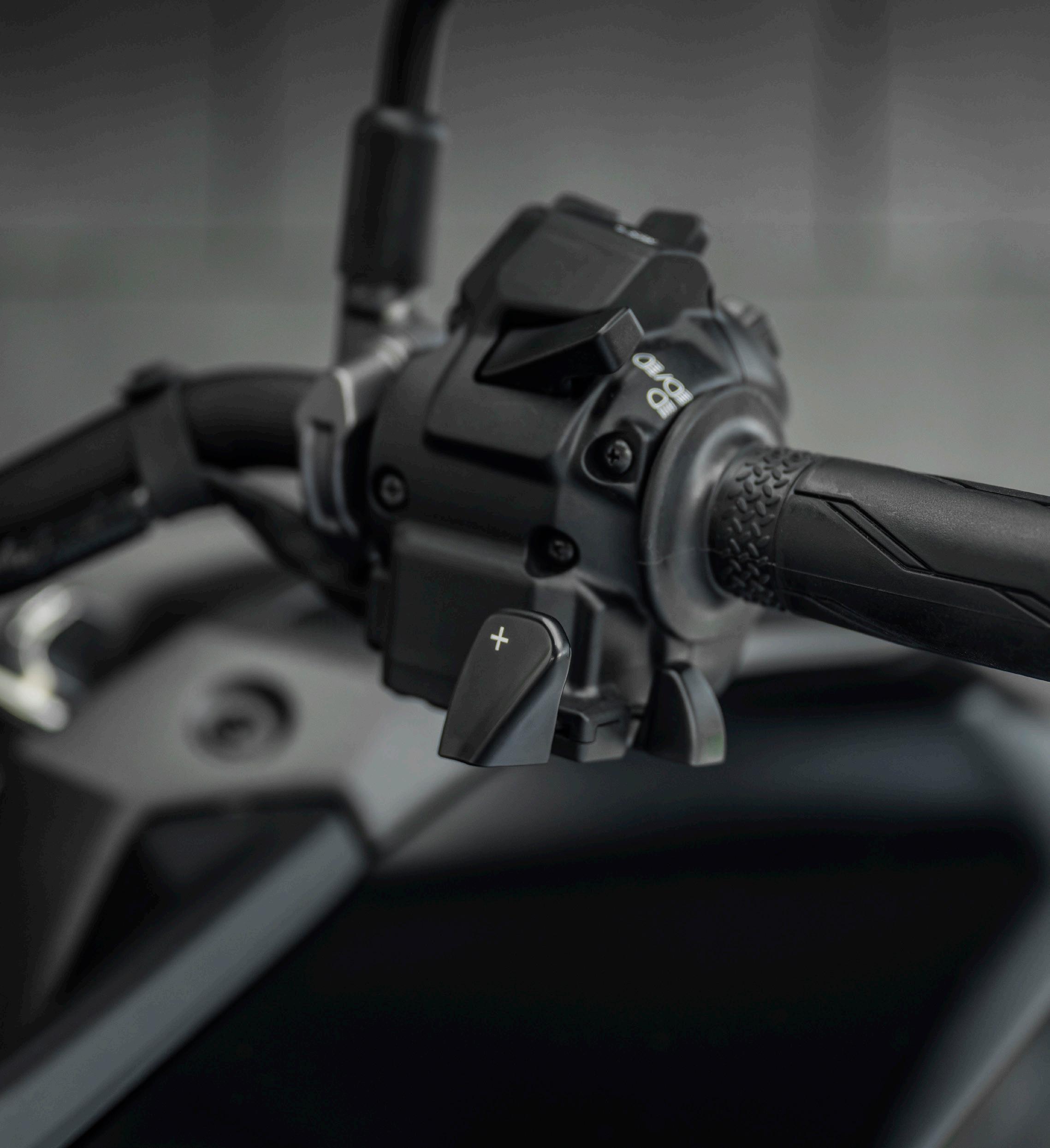 TRACER 9 GT Y-AMT har førsteklasses, nye baggrundsbelyste kontakter, der gør det nemt at bruge alle funktioner om natten. De ergonomisk designede kontaktgrupper omfatter et 5-vejs joystick, der er forbundet med 7” TFT-instrumenteringen, og en vippekontakt til manuelle gearskift, der betjenes med en finger.
