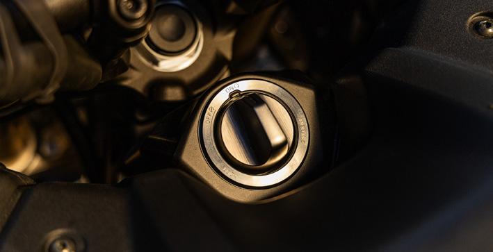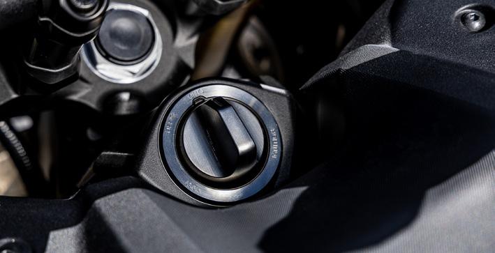 Smart nøgleteknologi med centrallåsning Yamaha’s Smart Key System giver dig mulighed for at starte TRACER 9 GT+ uden en fysisk tændingsnøgle. Nøglebrikken fungerer i nærheden af motorcyklen og giver mulighed for central låsning og oplåsning af alle funktioner, herunder styrlåsen, tankdækslet og de hårde standard-sidetasker som forbliver sikre, når smartnøglen er uden for rækkevidde. Når topboksen, som er originalt Yamaha tilbehør, er monteret, fungerer den også på samme måde.