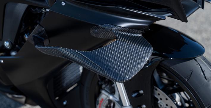 R9 är en av de mest aerodynamiskt effektiva Yamaha-motorcyklarna hittills, och detta uppnås genom en kombination av framkåpans design som genomgått omfattande vindtunneltestning. Downforce-winglets direkt nedanför strålkastarna minskar framhjulslyftet och förbättrar vägkontakten. Enbart winglets minskar framhjulslyftet med 6–7 % i en rak linje, och i kombination med frontspoilern nedanför M-kanalen ökar effekten till cirka 10 % vid kurvtagning.