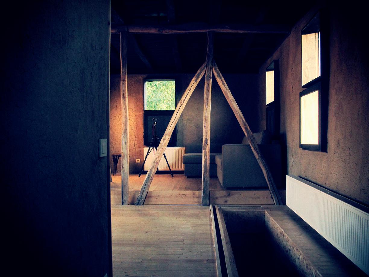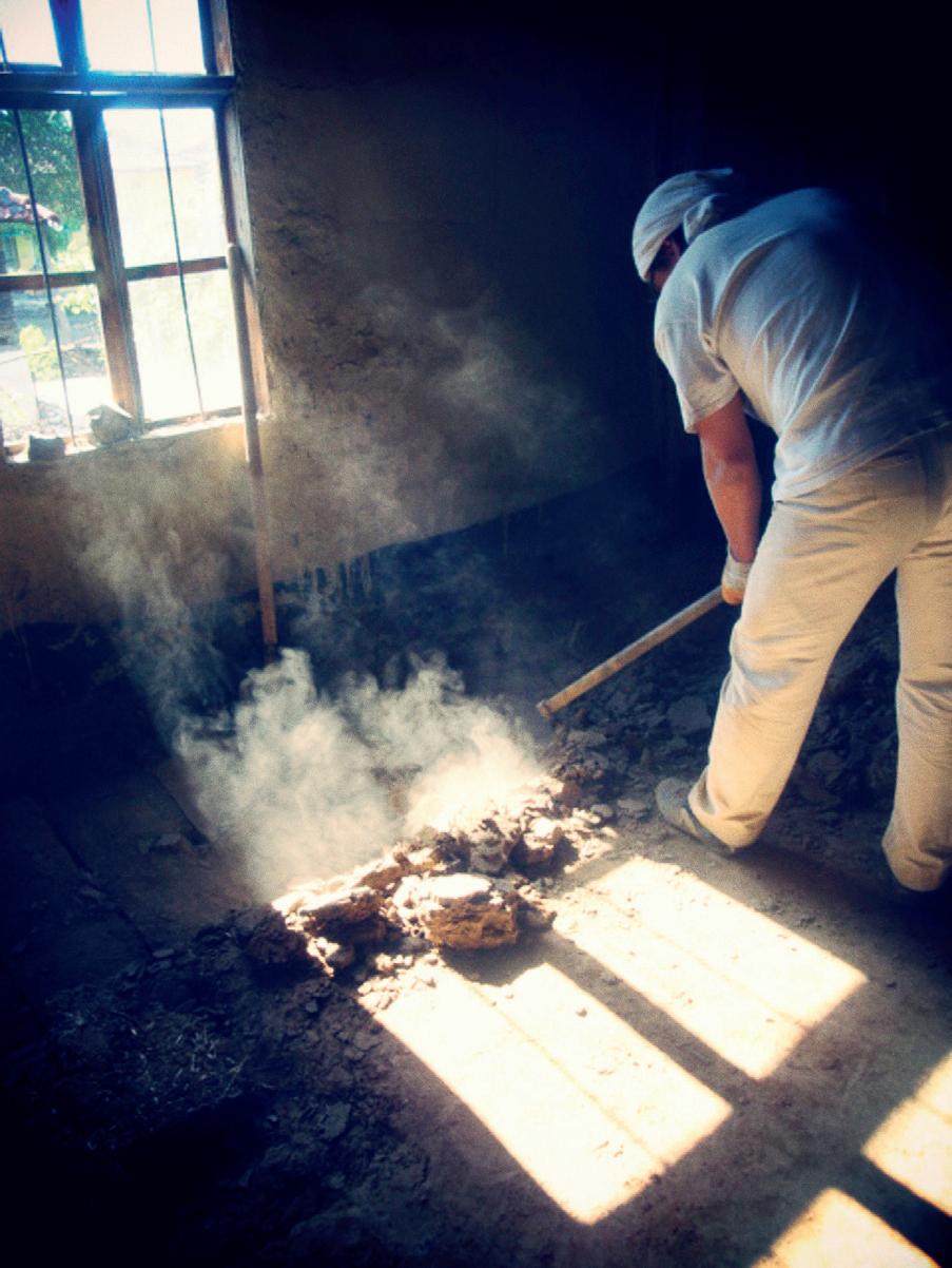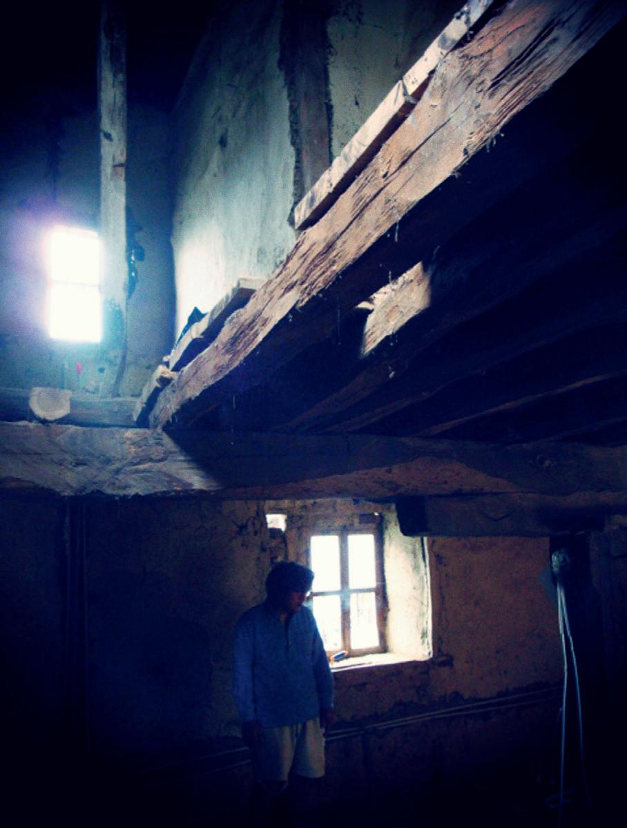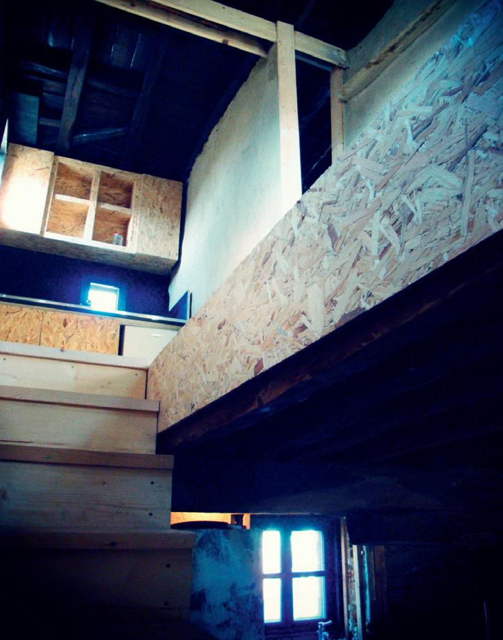 From here on I had to deal with the new design, but was somewhat challenged. Not a single straight horizontal or vertical line was to be found in the house; all the beams and columns were askew. It was impossible to have a proper surveying or an accurate plan. So, using what was easily available, armed with a hose pipe, I started levelling, thus laying the frame in which the new design elements would fit. I had planned for all of them to be independent and implanted into the house’s flesh. That was the method I decided to use. The other condition was for me to do everything by myself, without any plans. Thus the new space was being born in the dialogue between me and the house. The earth we took off the walls that we tore down was soaked into water and then used as plaster. The hundred-year-old straw, mud, and manure were resurrected and once again became part of the house.