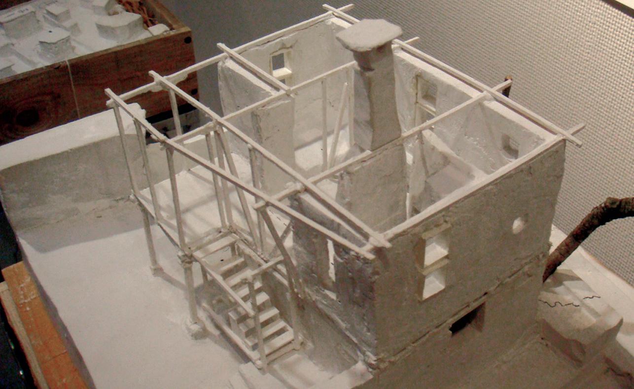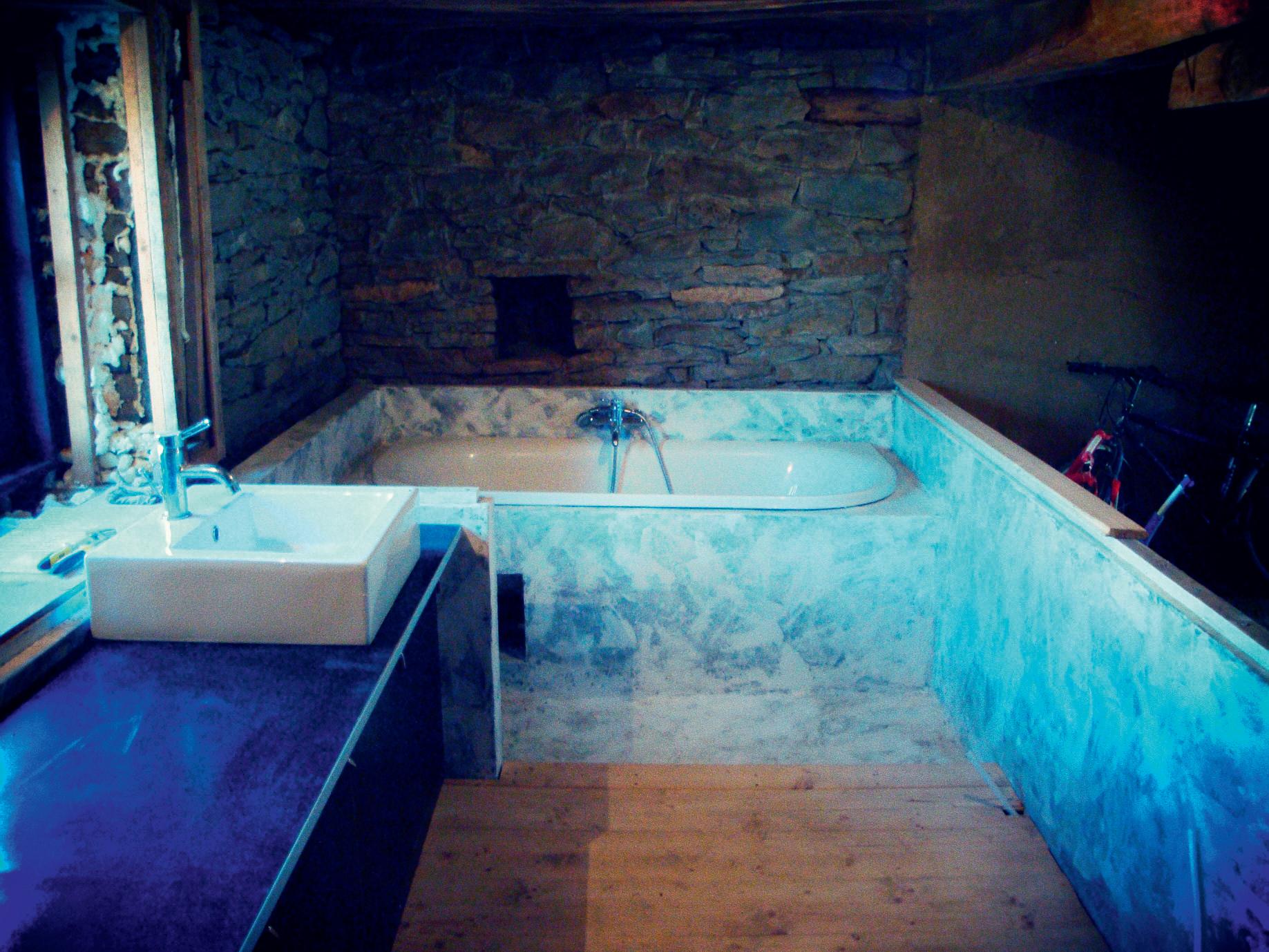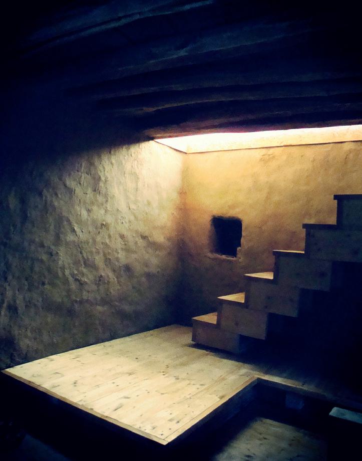 From here on I had to deal with the new design, but was somewhat challenged. Not a single straight horizontal or vertical line was to be found in the house; all the beams and columns were askew. It was impossible to have a proper surveying or an accurate plan. So, using what was easily available, armed with a hose pipe, I started levelling, thus laying the frame in which the new design elements would fit. I had planned for all of them to be independent and implanted into the house’s flesh. That was the method I decided to use. The other condition was for me to do everything by myself, without any plans. Thus the new space was being born in the dialogue between me and the house. The earth we took off the walls that we tore down was soaked into water and then used as plaster. The hundred-year-old straw, mud, and manure were resurrected and once again became part of the house.