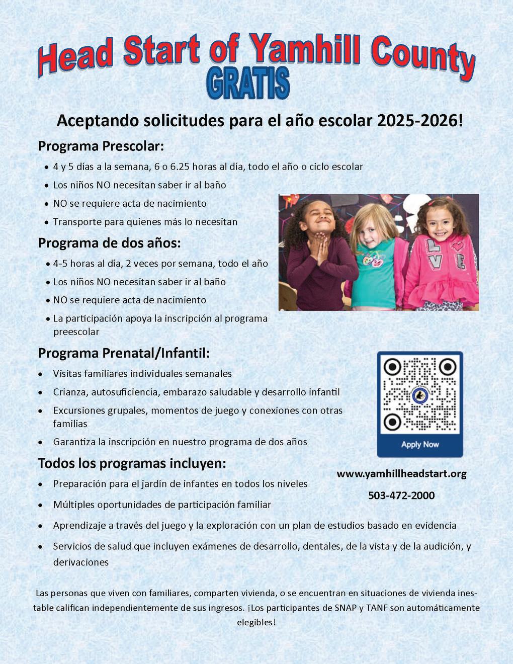 ¿Tienesuhijotreso cuatroaños?Esposible quepodamosofrecerle oportunidadesde ¡preescolargratuitoasu familia!Visite yamhillpreschool.org, ollameal(971)261-1910.
