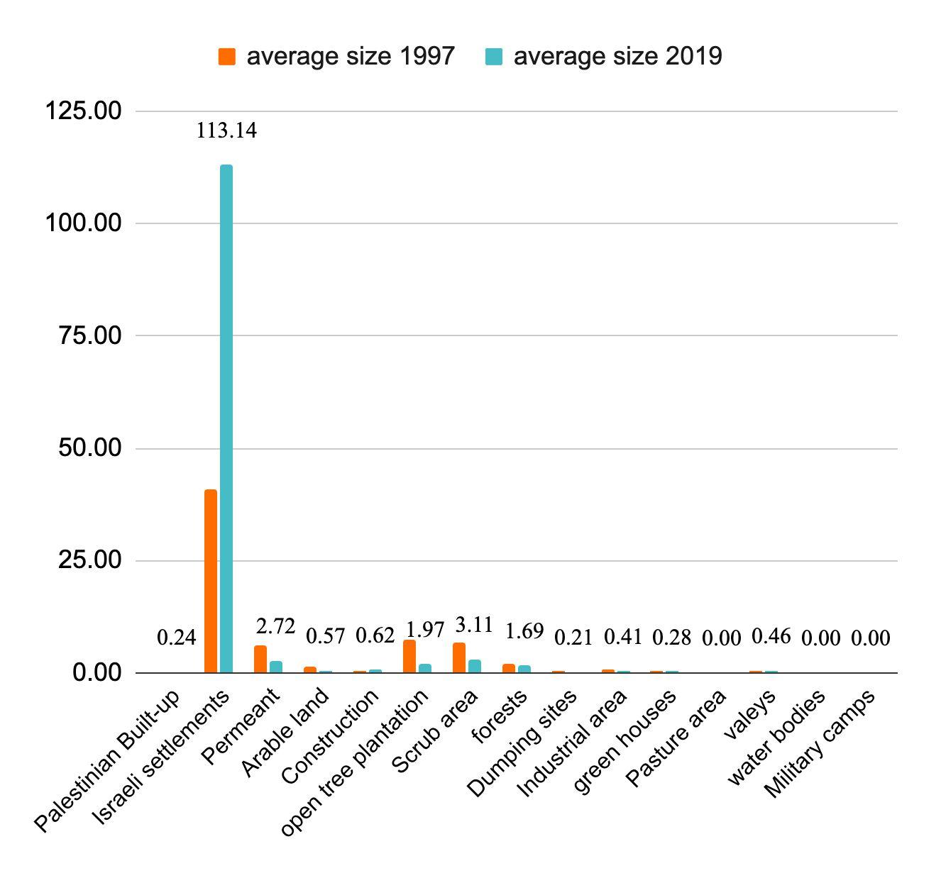 The Unpaved roads in 1997 has expanded from 20.23 hectare to become 125.78 hectare in 2019.Mostofthedecrease(loss)hasbeenconverted to the Palestinian built-up area.While most of the increase (gain) from the scrub area and permanent agriculturaltrees.(Return to table 12 and diagram 12)