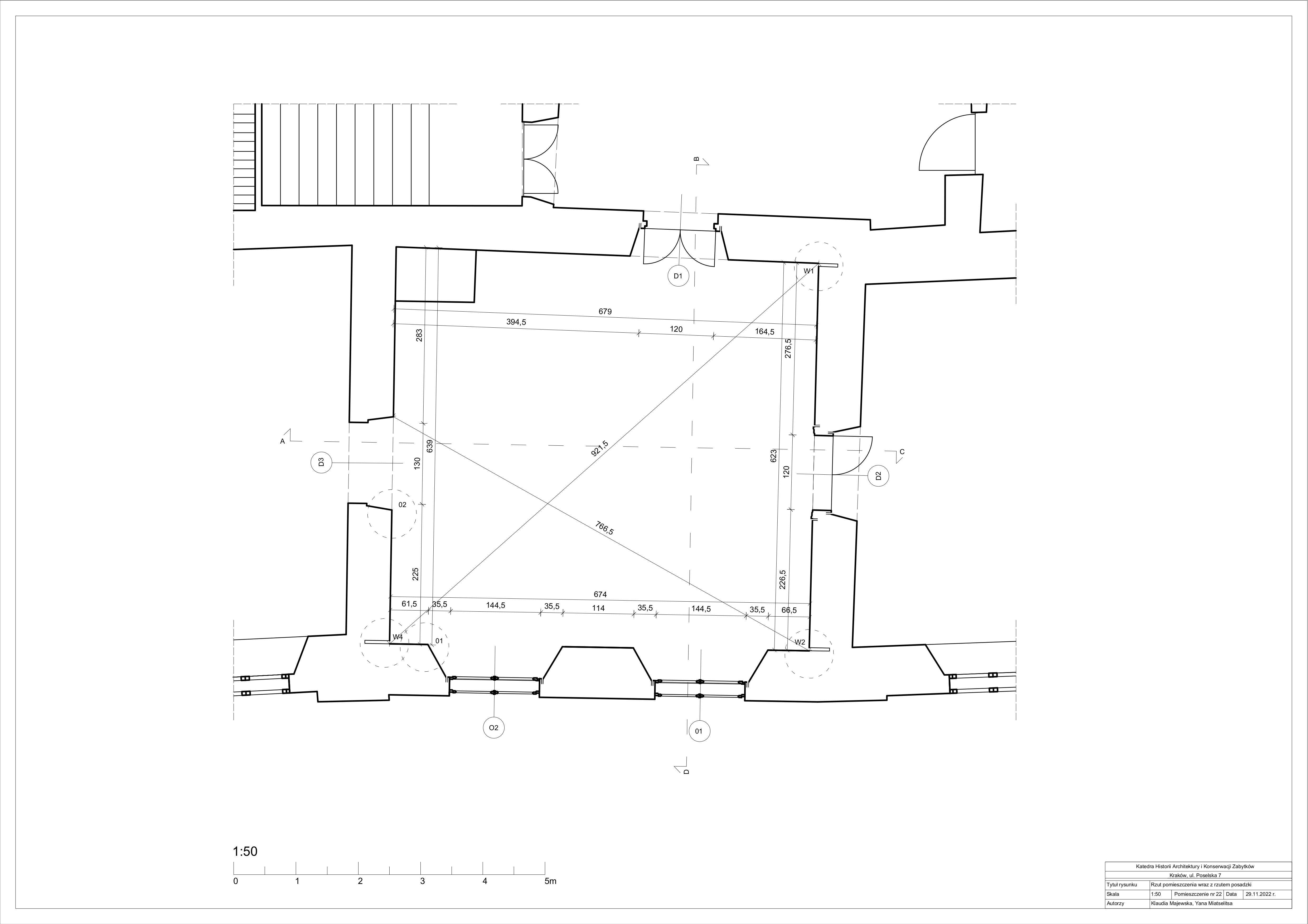 W1 P14 P19 P15 P16 P18 P17 P20 P21 P23 P22 P30 P24 P25 P26 P27 P28 P29 P31 P32 P33 W2 623 261,5 150 211,5 409 111 176 23 83,5 15 216 12 165,5 15 213 15 W2 P35 P34 P36 P37 P40 P38 P39 P41 P42 01 P43 P44 P45 W3 674 61,5 216 114 216 66,5 407 111 184 15 67 30 P1 P2 P3 P4 P5 P6 P7 P8 P9 P10 P11 P12 P13 W1 679 410,5 228 182,5 375,5 158 145,5 211 14 155 30 213 15 152 30 W4 P46 P47 P48 P49 P51 P49 P50 P52 P54 P53 P55 P56 P57 P58 P59 O2 408 225 168,5 14,5 637 215 150 272 50 Katedra Historii Architektury Konserwacji Zabytków Kraków, ul. Poselska 7 Przekroje Tytuł rysunku Skala 1:50 Pomieszczenie nr 22 Data 23.11.2022 r. Autorzy Klaudia Majewska, Yana Miatselitsa