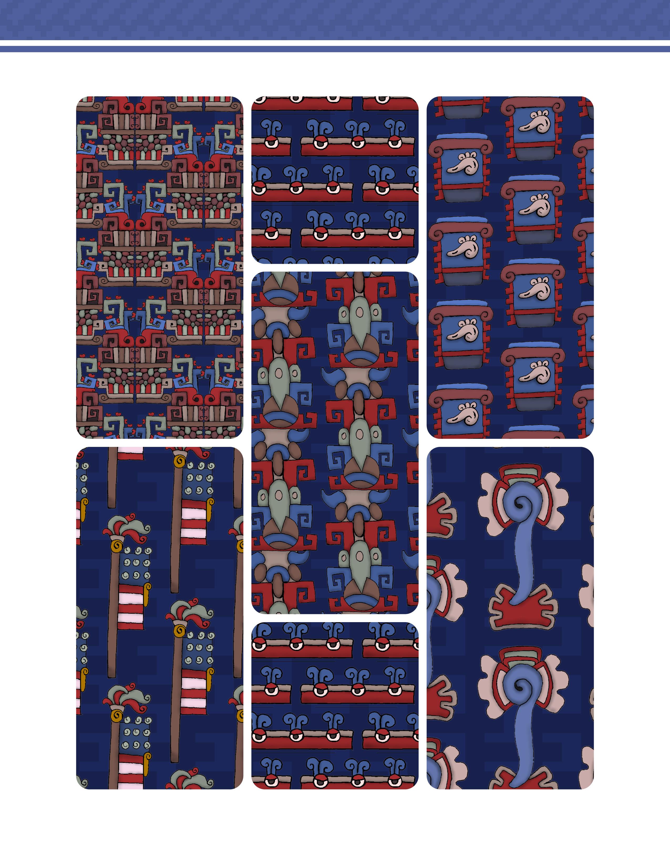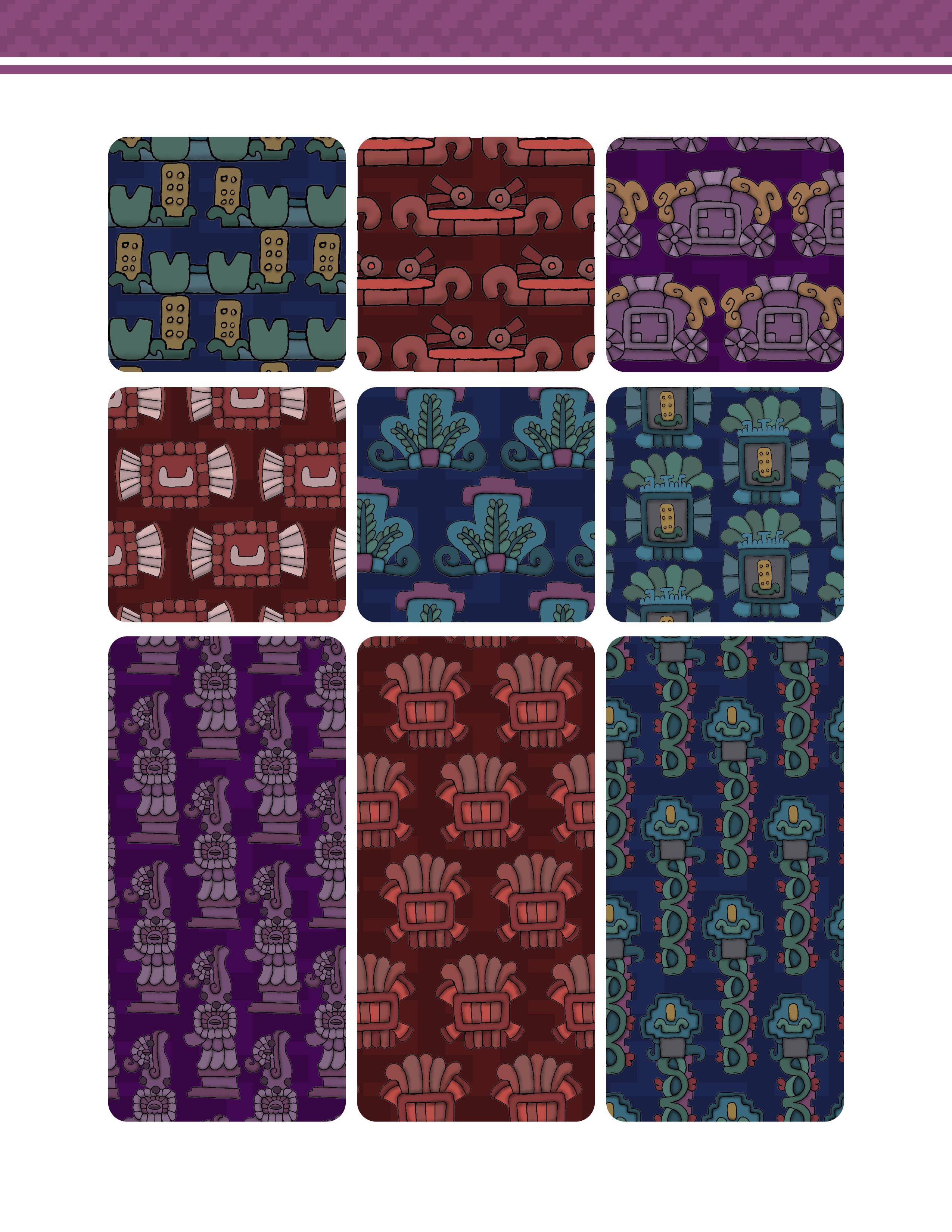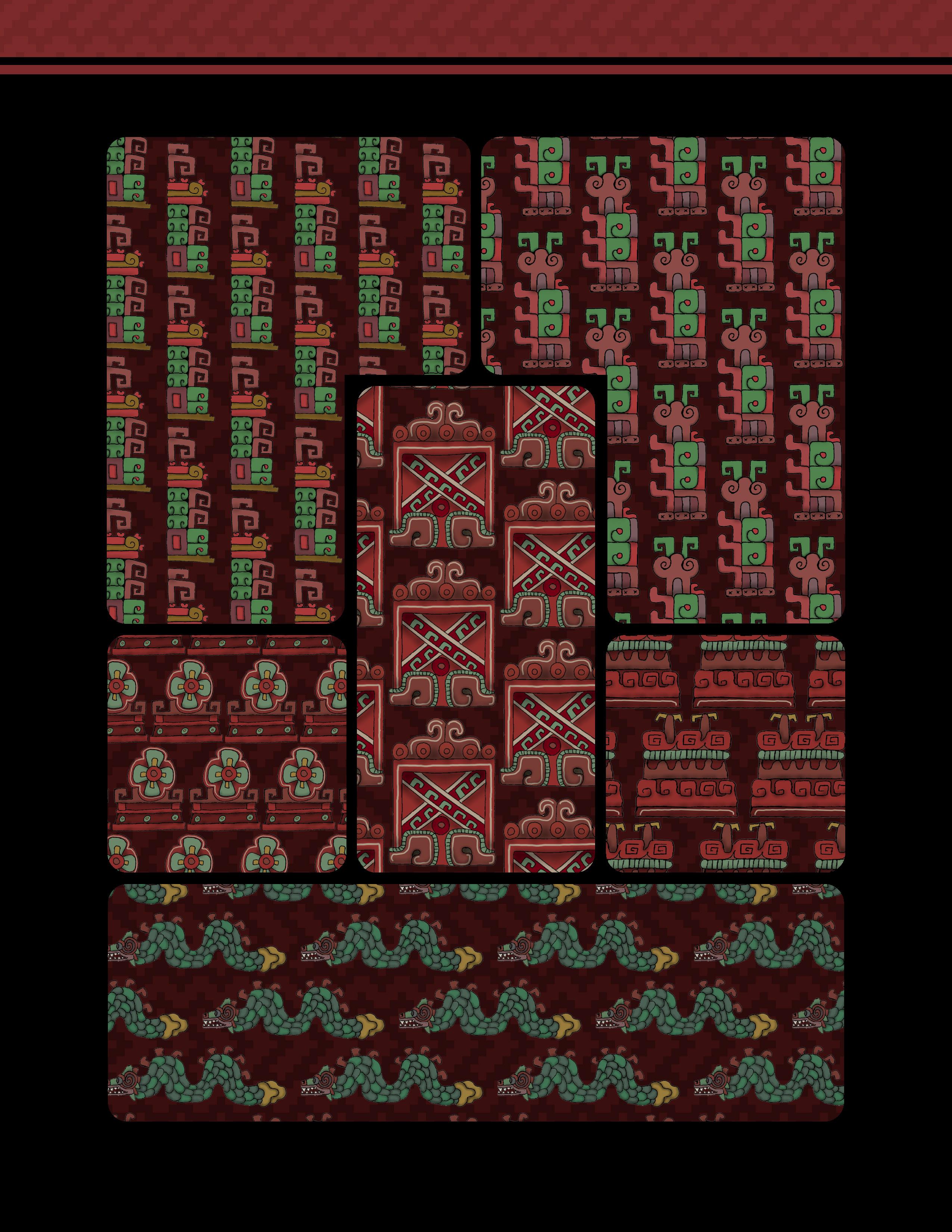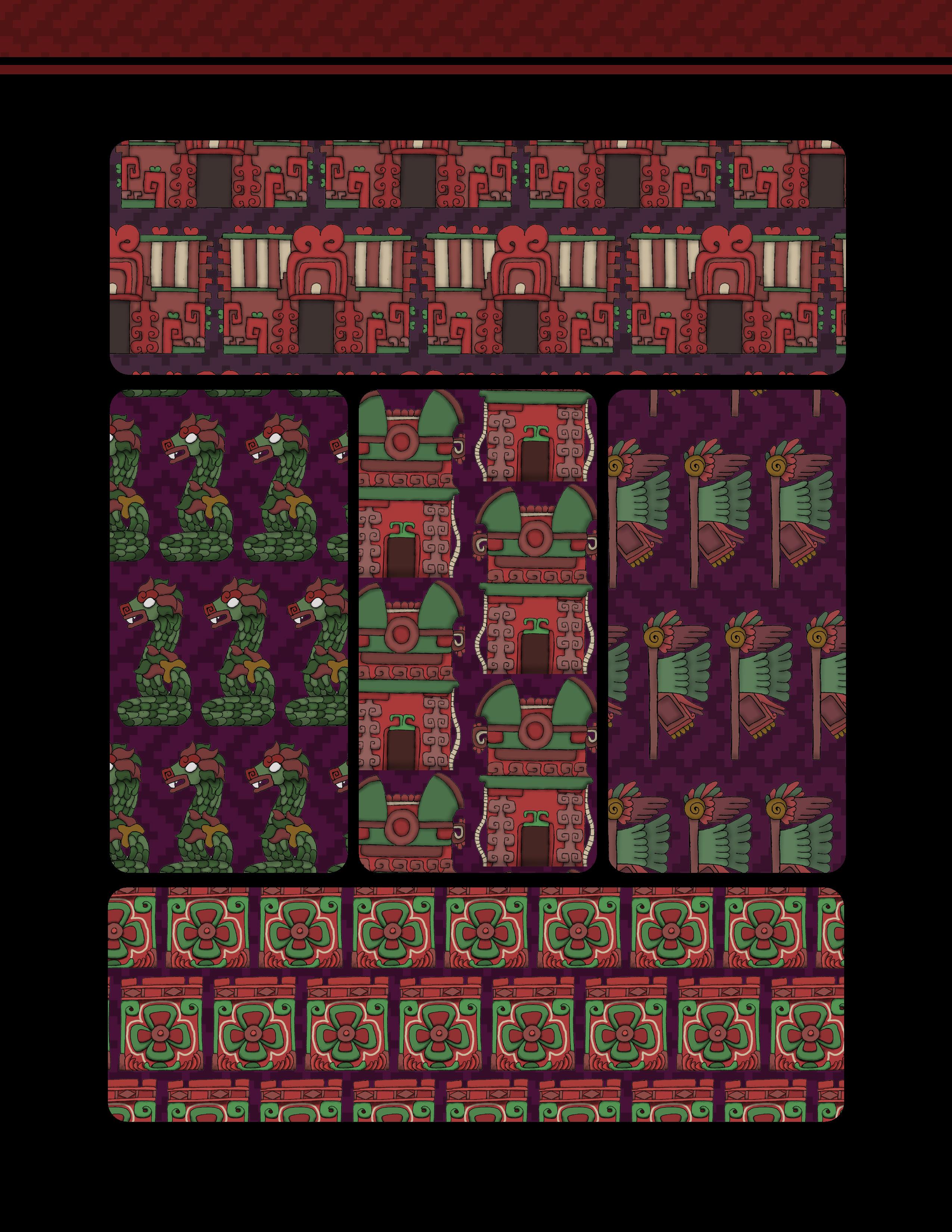 Es un trabajo que presenta una vasta colección de patrones y diseños inspirados en la herencia gráfica y las artes de las culturas prehispánicas de México. Este libro ofrece una reinterpretación moderna de aquella belleza antigua, en forma de patrones y diseños extraídos meticulosamente de códices antiguos, arquitectura monumental, esculturas y otros artefactos arqueológicos. Los patrones están organizados de manera que tanto artistas, diseñadores gráficos, artesanos y aficionados a la cultura mexicana pueden encontrar inspiración y utilidad en ellos.