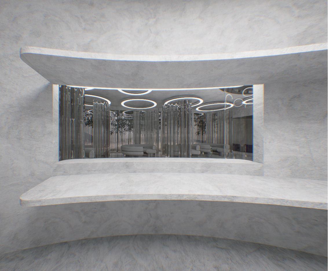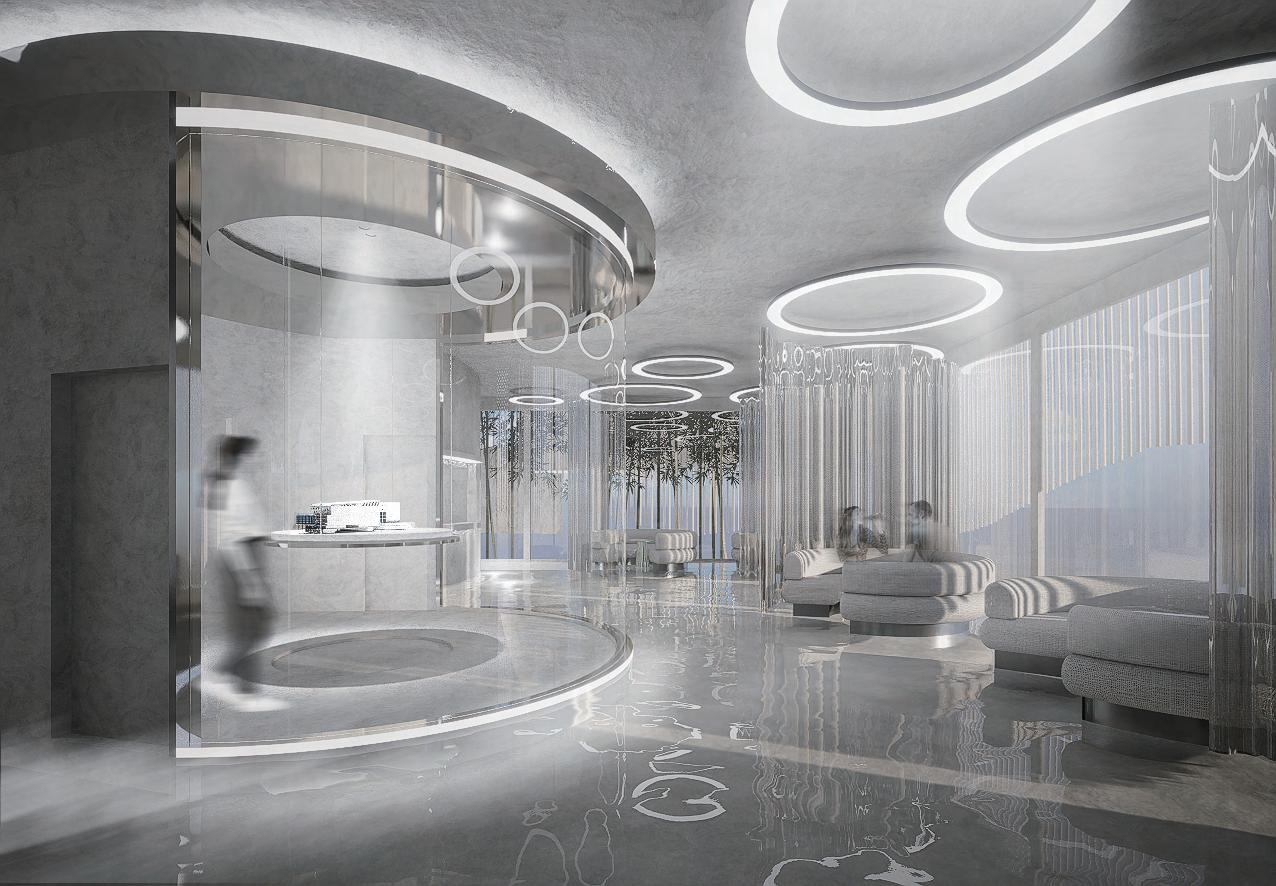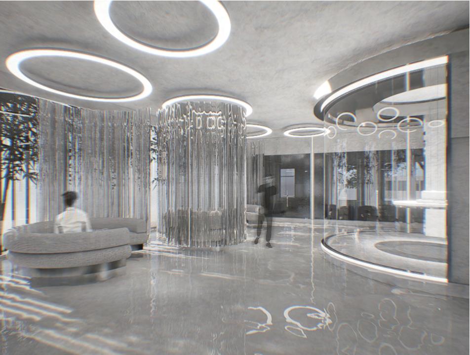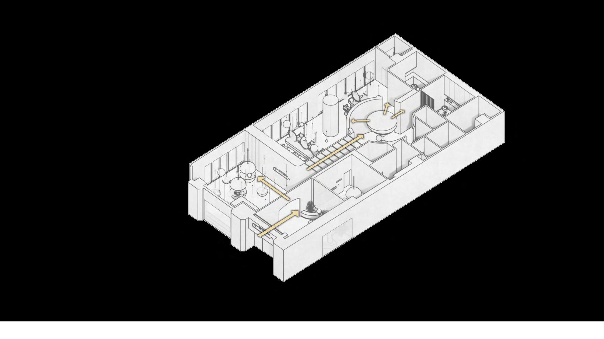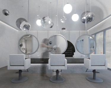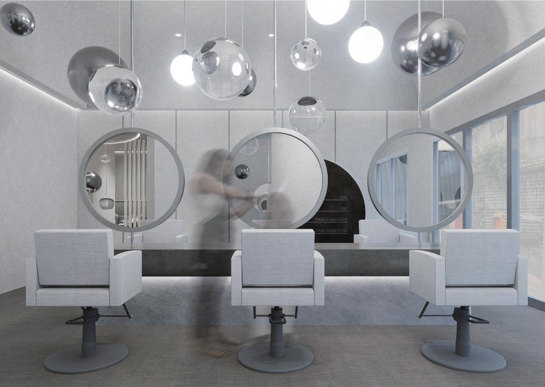 迴廊空間作為空間的中界點,連接了各個區域,包括理髮區 、洗髮區等,因此設計上選擇以圓型做為空間造型,使其成 為空間焦點,也使整體動線變得更流暢。
