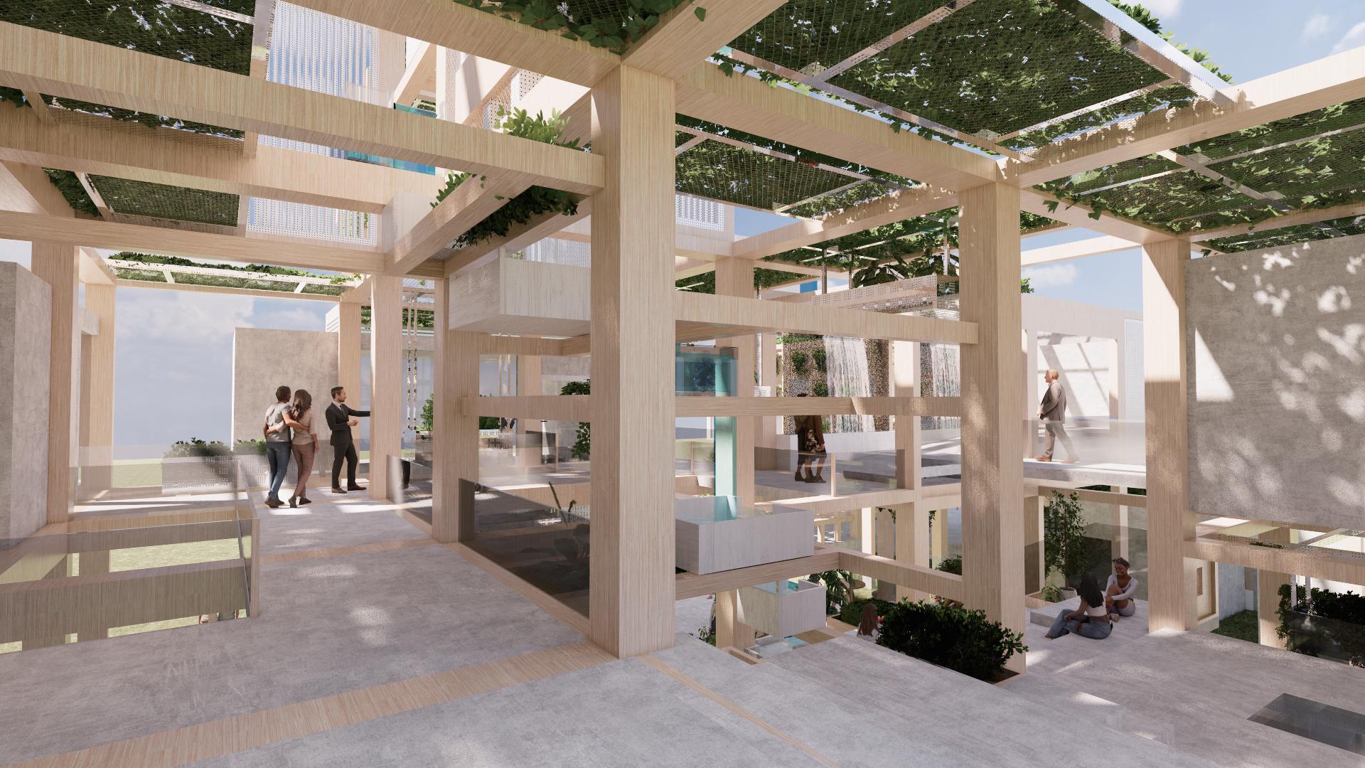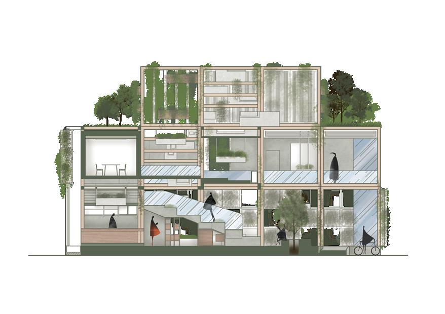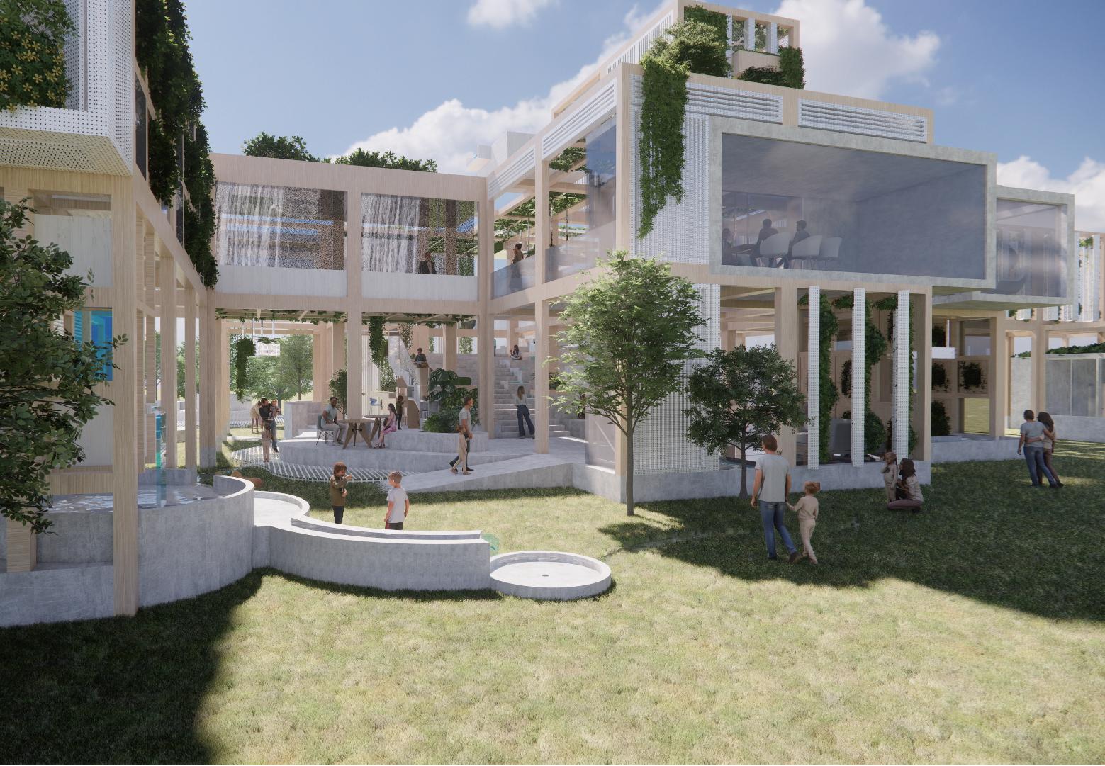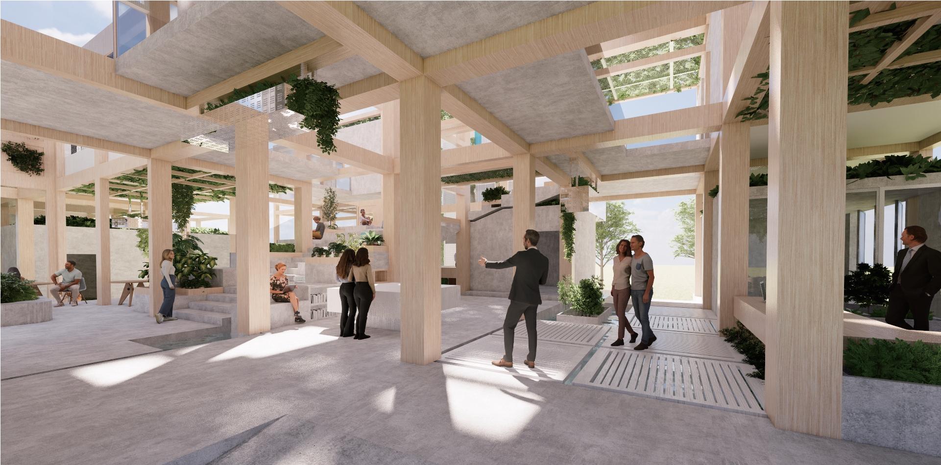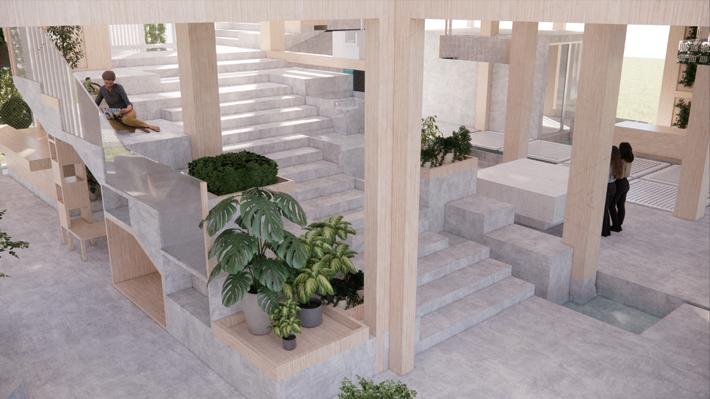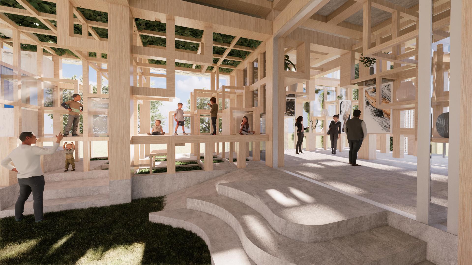 利用錯層與半開放式設計創造一個0~100歲皆能使用的共享空間,木結構連結了自然,空間中穿插著許多植物,一座天然遊樂場能使居民們能 夠森呼吸更使地球能夠深呼吸。