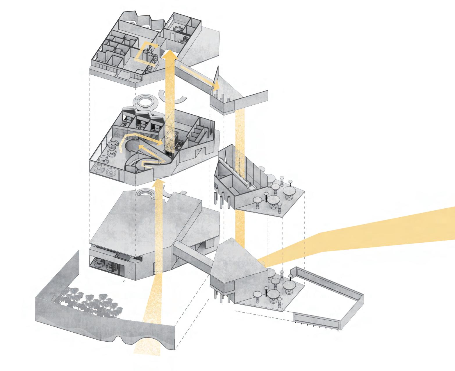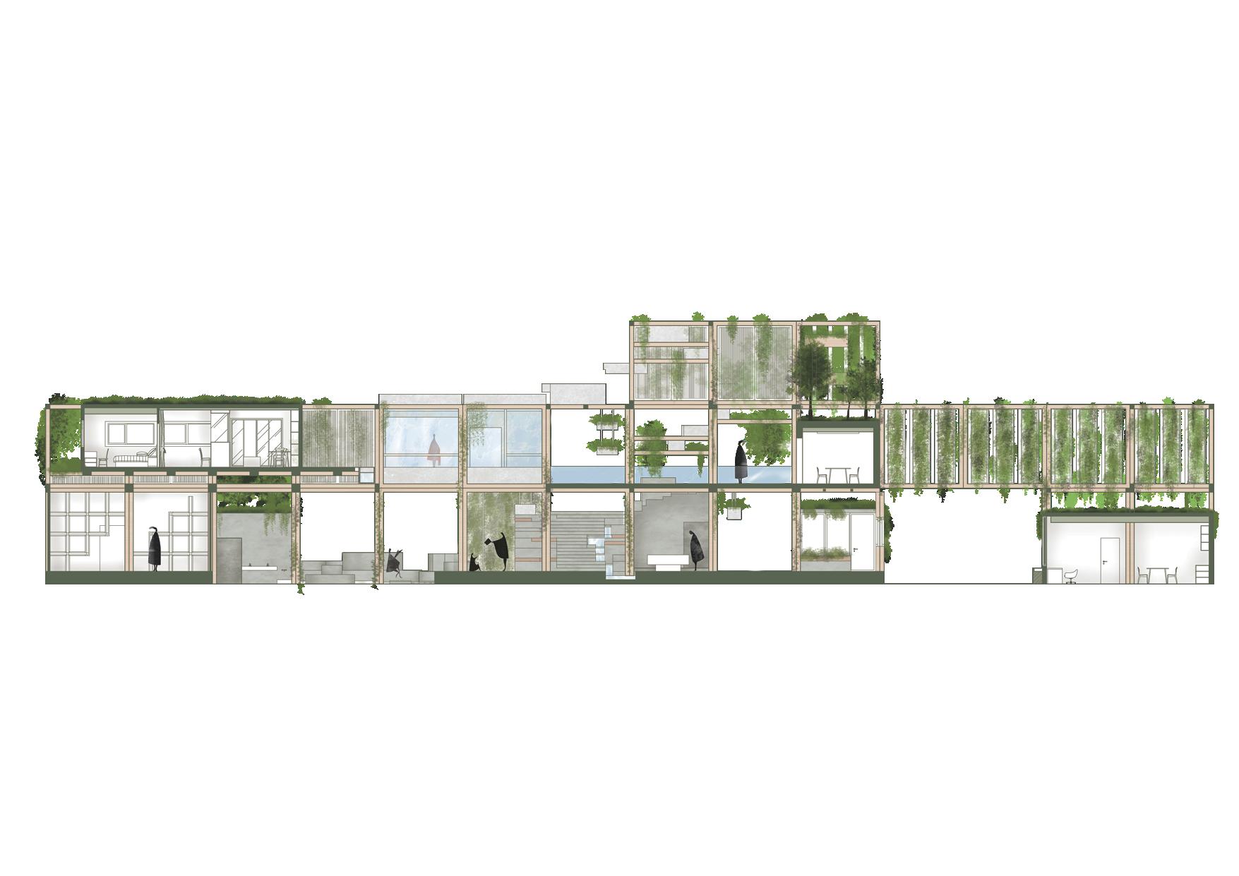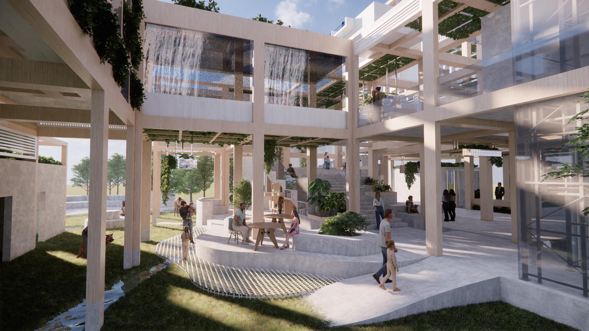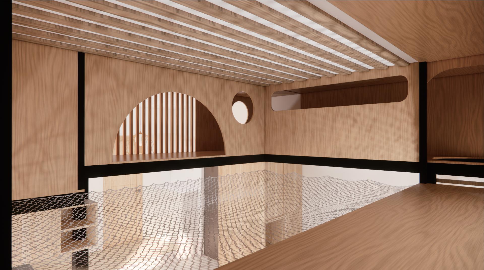 利用錯層與半開放式設計創造一個0~100歲皆能使用的共享空間,木結構連結了自然,空間中穿插著許多植物,一座天然遊樂場能使居民們能 夠森呼吸更使地球能夠深呼吸。