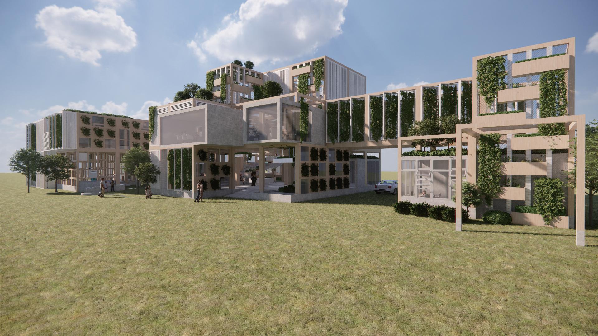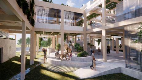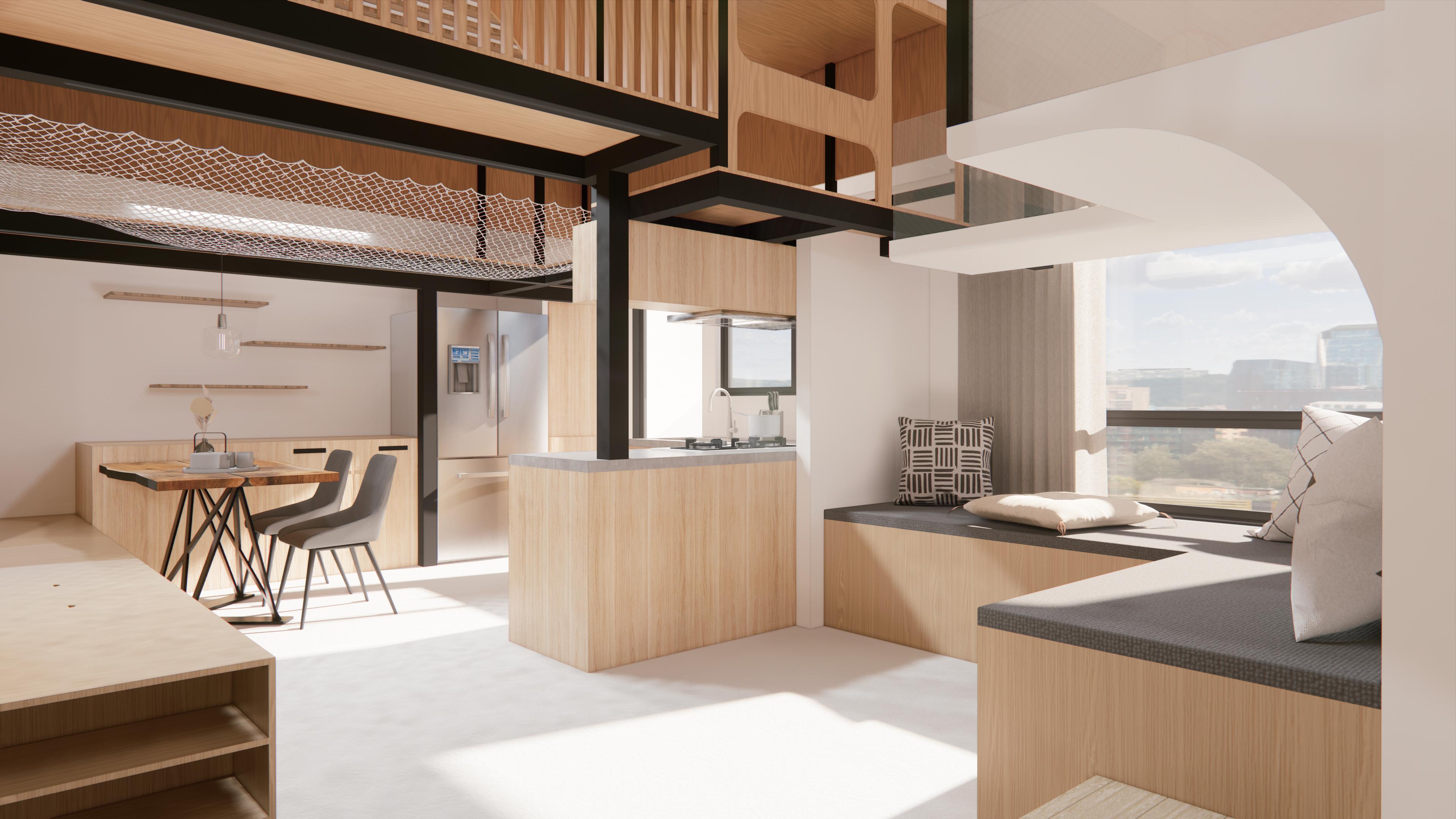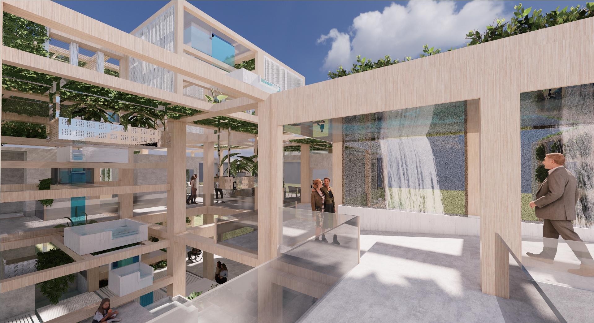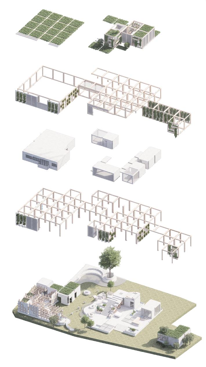 利用錯層與半開放式設計創造一個0~100歲皆能使用的共享空間,木結構連結了自然,空間中穿插著許多植物,一座天然遊樂場能使居民們能 夠森呼吸更使地球能夠深呼吸。