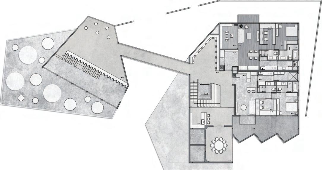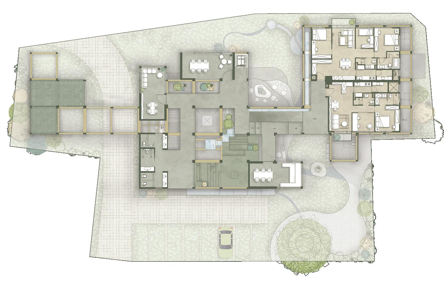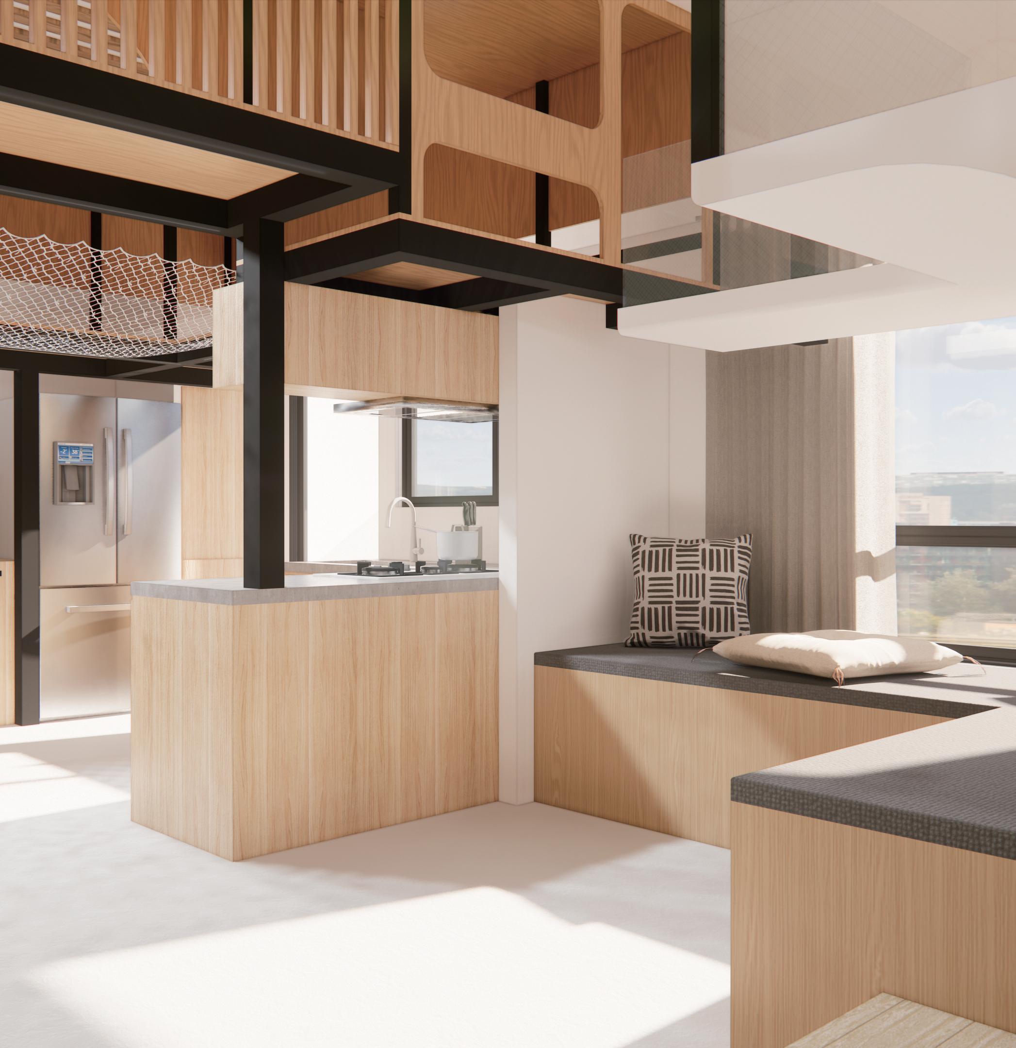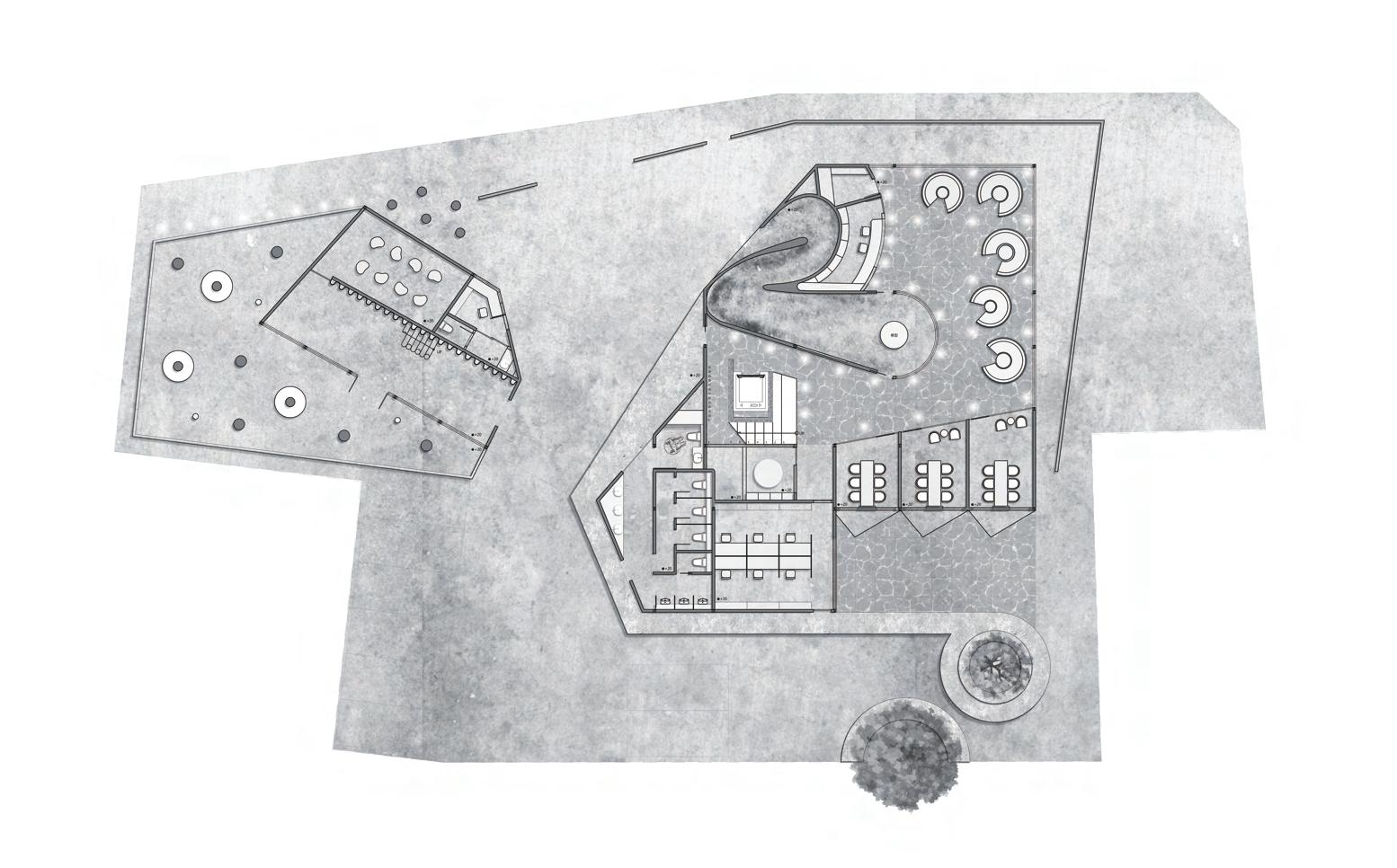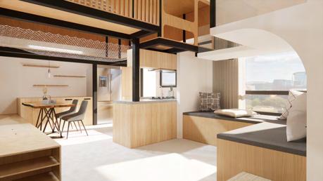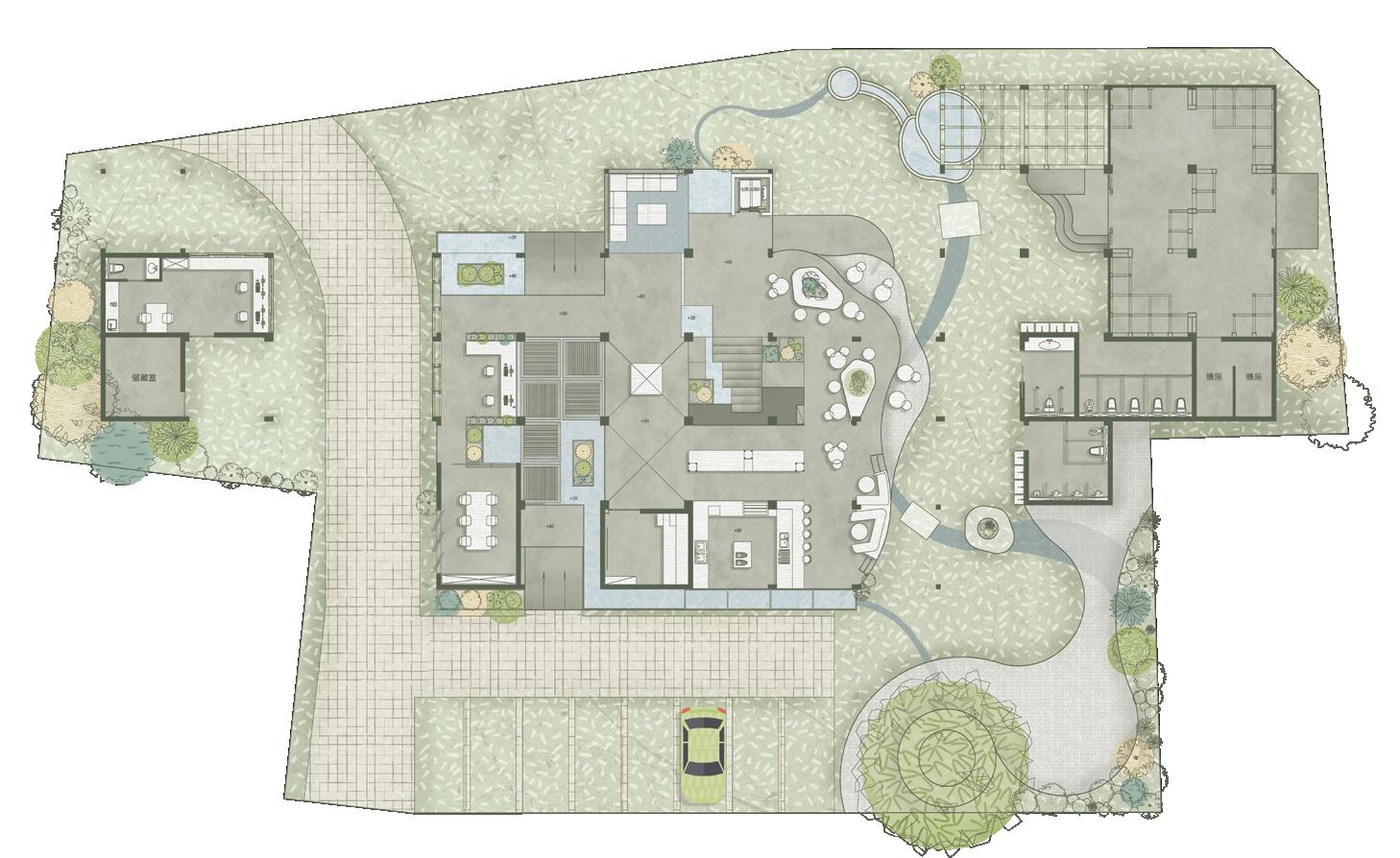 利用錯層與半開放式設計創造一個0~100歲皆能使用的共享空間,木結構連結了自然,空間中穿插著許多植物,一座天然遊樂場能使居民們能 夠森呼吸更使地球能夠深呼吸。