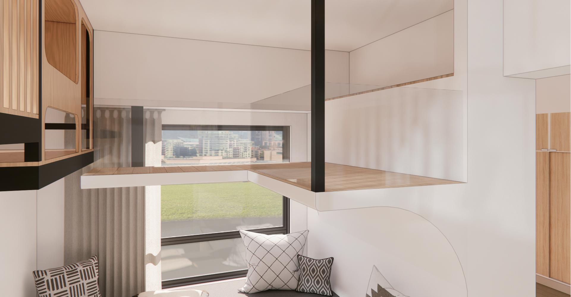 利用積木堆疊的方式將家具組合堆疊,讓空間既能儲藏收納的功能又可以兼具童趣。
