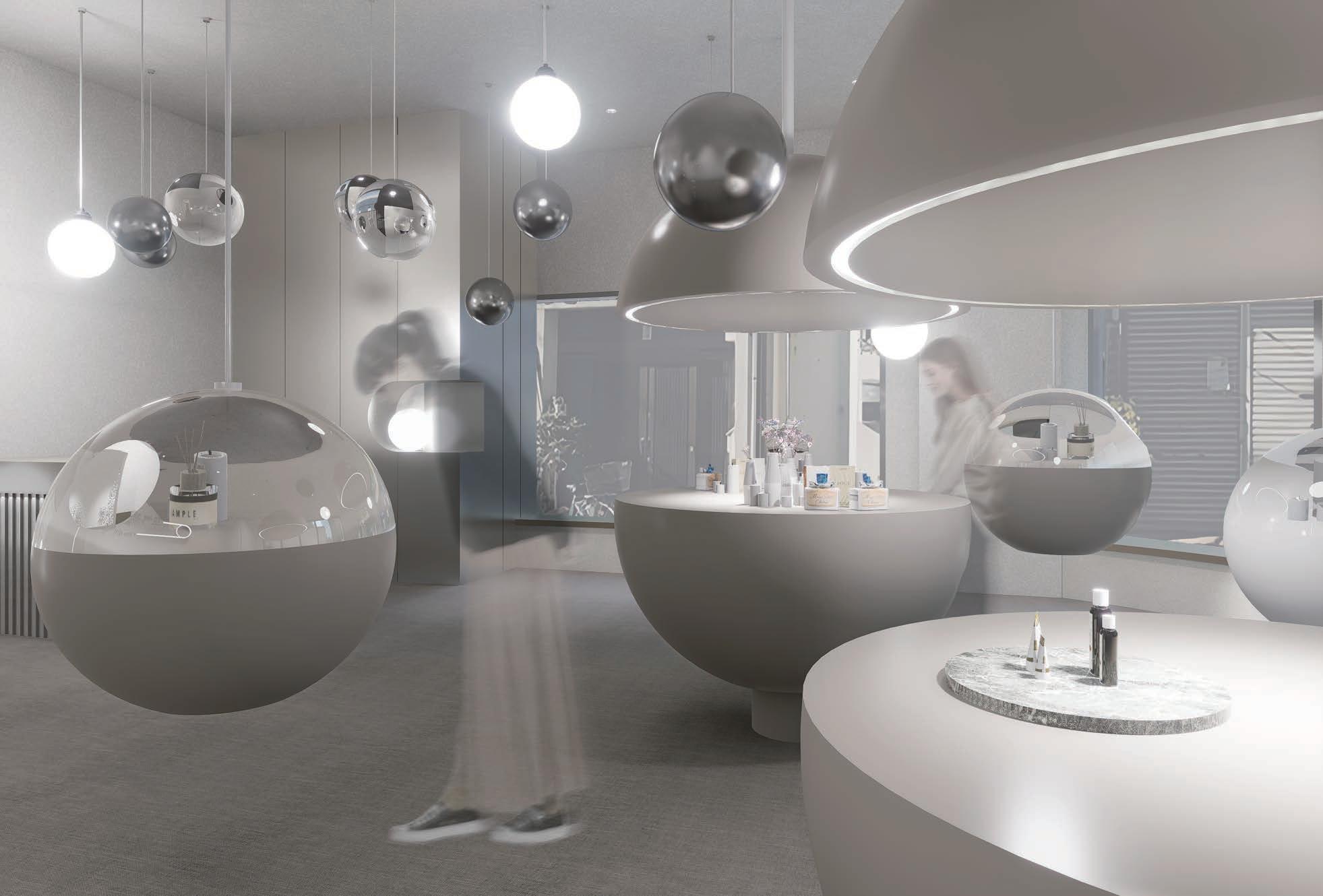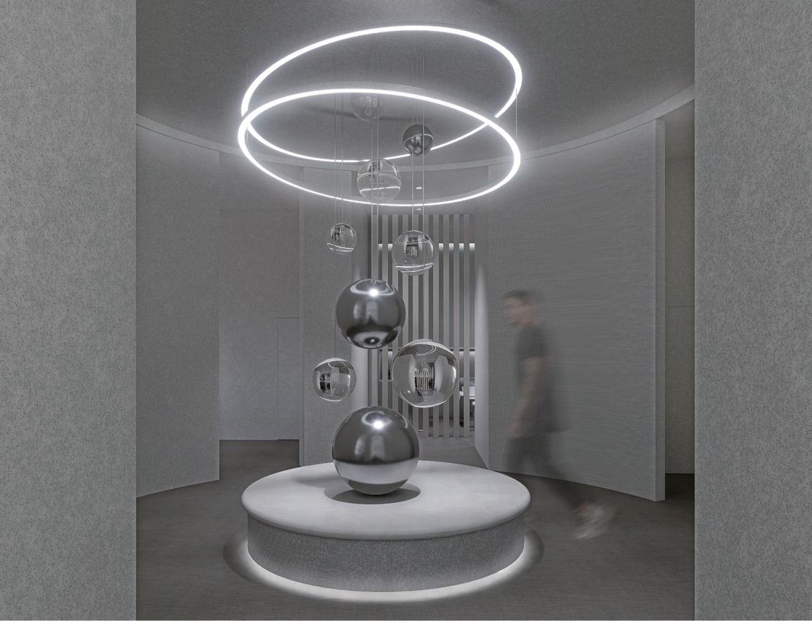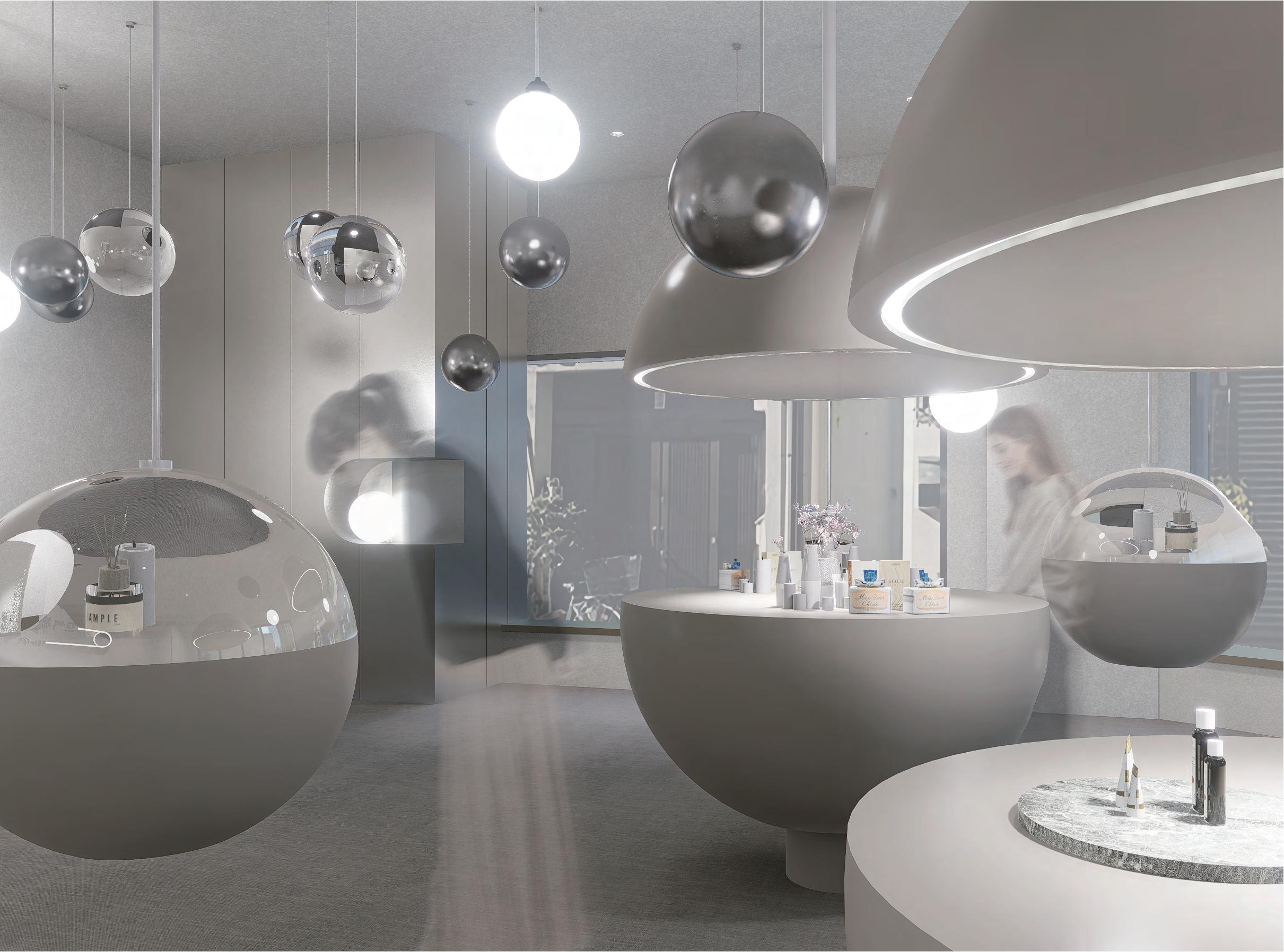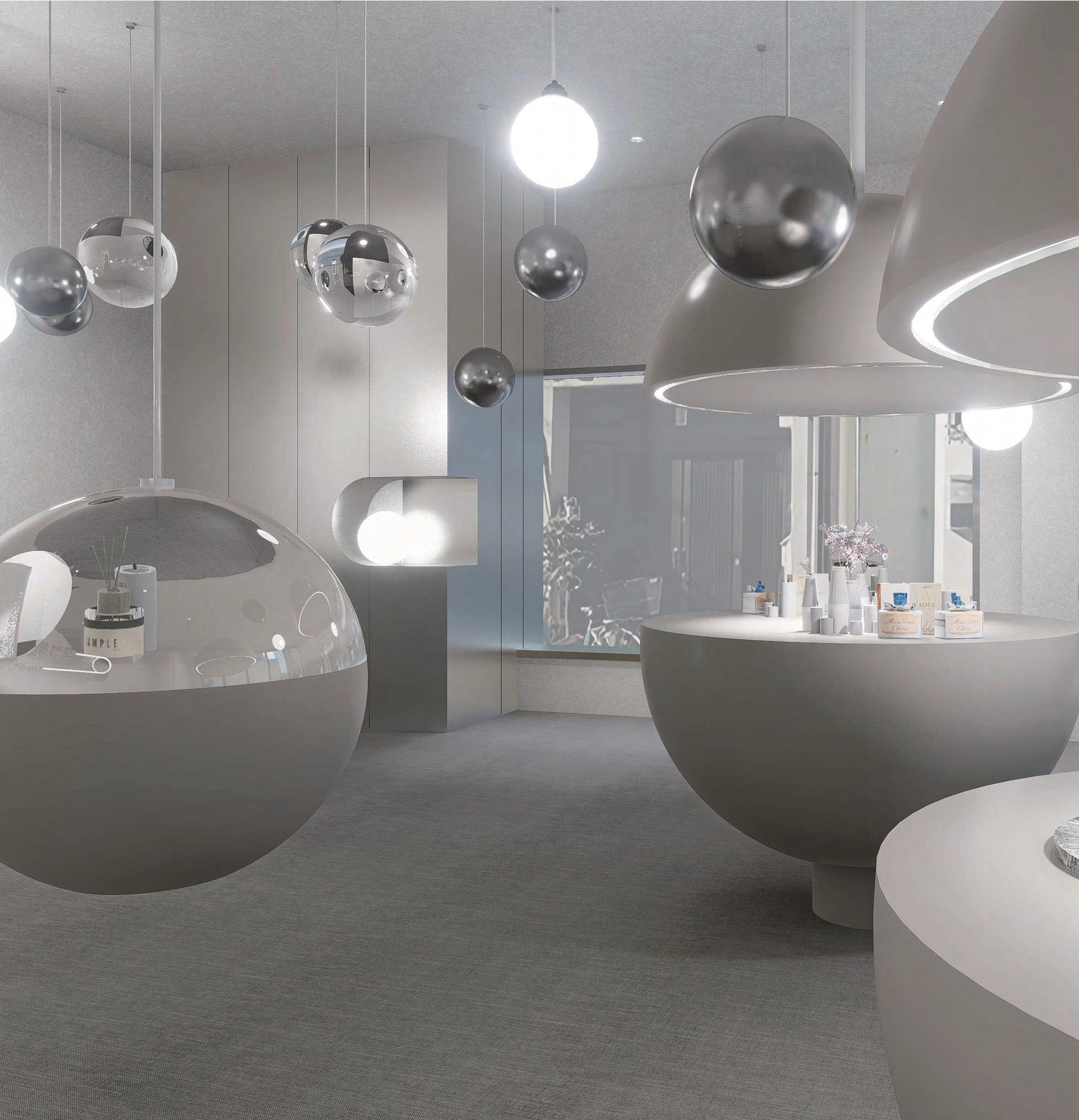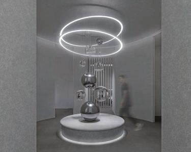 分子造型與玻璃、鏡面材質交織在一起,更結合了展示功能 ,穿梭在空間之中能夠在不經意間從材質的反射中看到自己