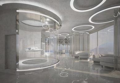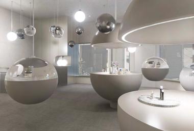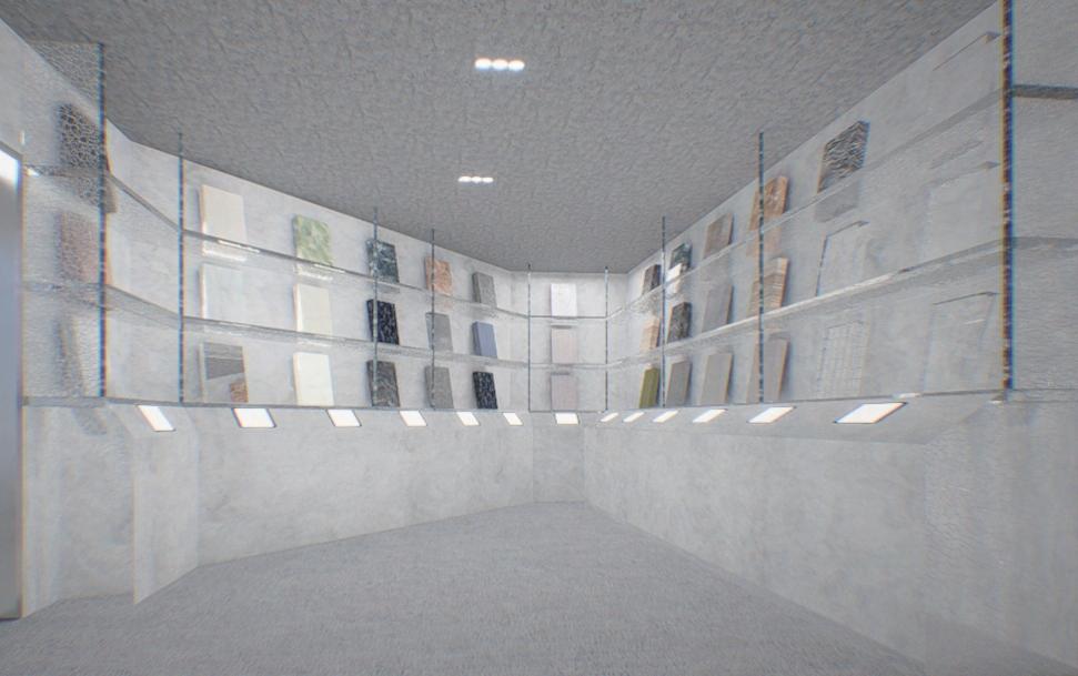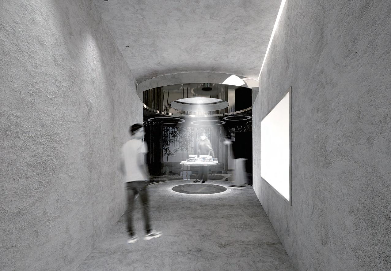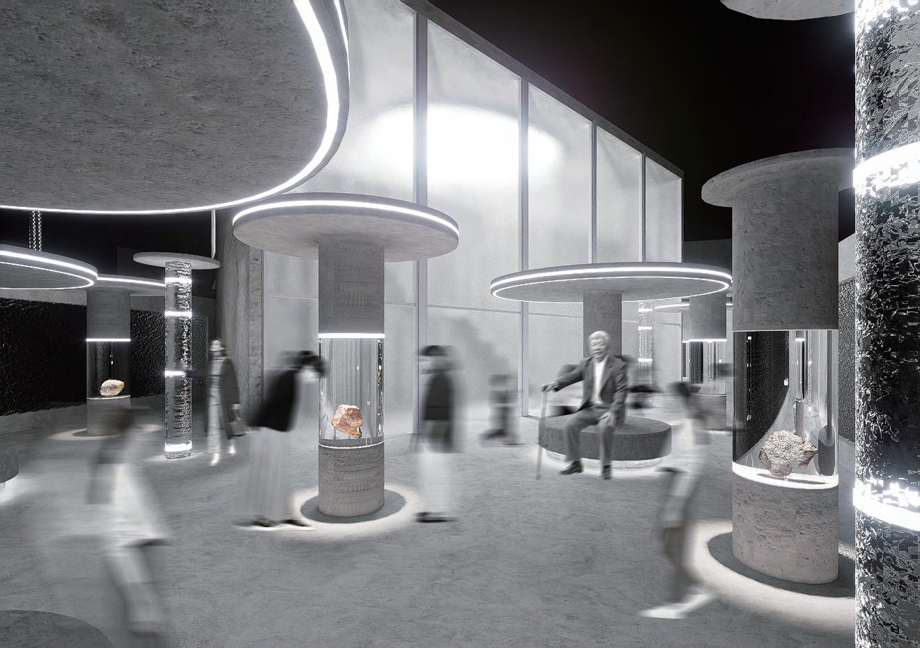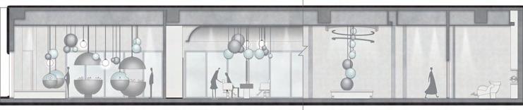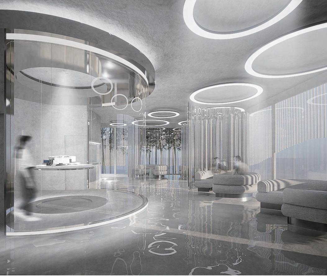 分子造型與玻璃、鏡面材質交織在一起,更結合了展示功能 ,穿梭在空間之中能夠在不經意間從材質的反射中看到自己