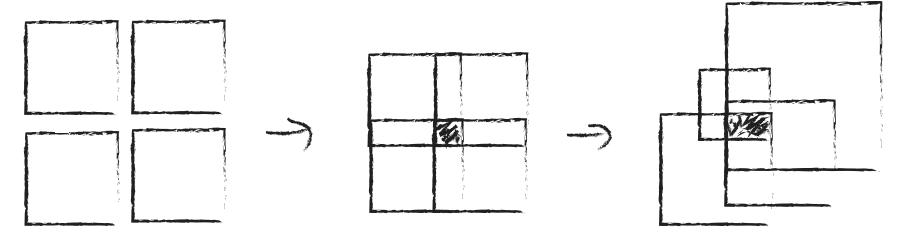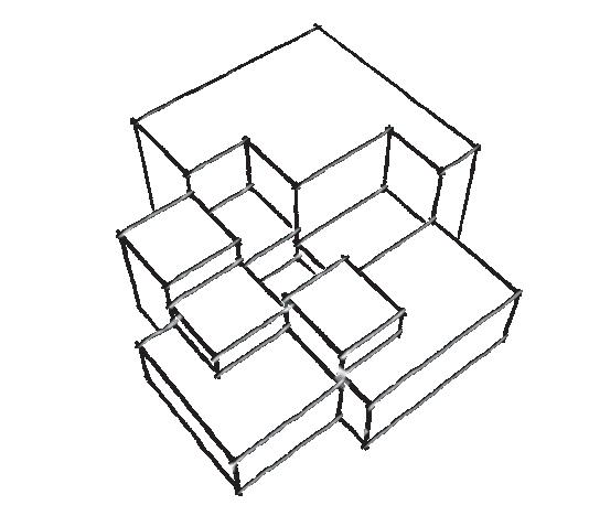 方塊透過拉伸形成高低不同的塊體,由高往內逐漸變 低,就像由四面八方向中心聚集。