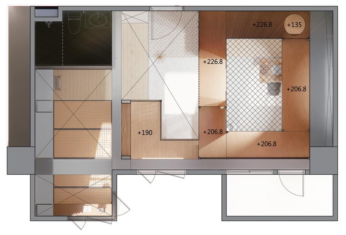 / 整家人的食衣住行吃喝玩樂幾乎都在家中,所以需要較大的客廳空間 / 未來六年小孩皆在與父母同睡的年紀,所以將主次臥合併 / 將儲藏空間結合進家具櫃體中以節省空間