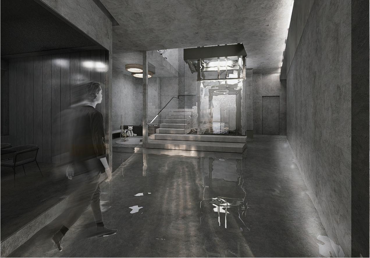 ,這種重複的自我映像不斷的提醒每個人都是這個空間中不 可或缺的組成元素,就如空氣一般。