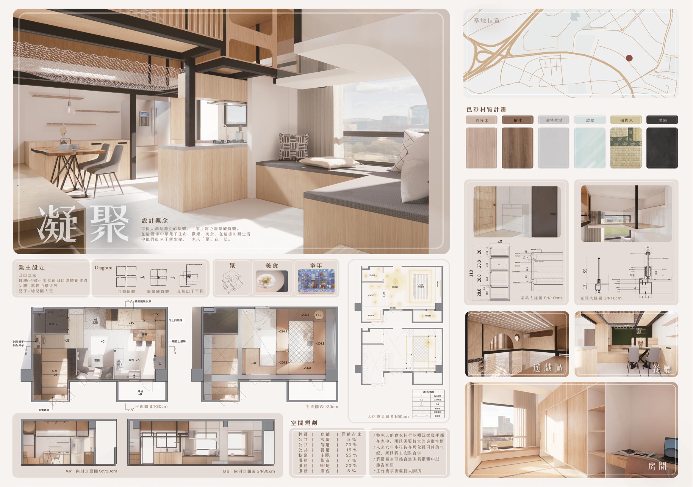 一個能滿足兒童及大人的日常生活空間,並能配合 業主工作性質,打造居家工作間,由徐空間狹小, 機能需要多方整合。