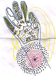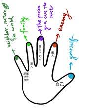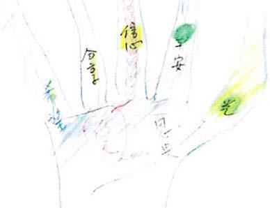 邀請大家騰出自己的手,不管是左手還是右手,用一個 最貼近你自己的一支筆,在最靠近手的地方,將他的形 狀描繪下來。每一根手指頭,指向不同的祝福。上帝的 手總是很有具能量的賜予我們在祝福之中,不同的個體 不同的差異。