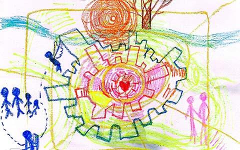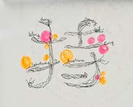 第三步,順著字的筆劃繪製一個圖皮框框,裡面加入你期待的美好環境和生活元素,比如風、 水、陽光、向上生長的植物、家人的擁抱等等。