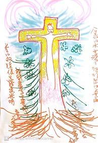 例如某次在十架上做畫,我看到十架廢墟黑泥中開出滿地多采的復活花絮,十架的苦難轉換成希望 的生命.