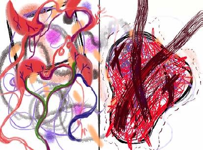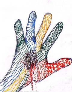 2.描寫釘痕:在手臂上釘十架的位置,用筆點刻畫,不停的點著,可以規則 或不規則,可以同色也可以換顏色。同時思想著,這些點點或許就像是兵丁 一次次的敲打,痛的入骨,卻也發散地超出了身體⋯