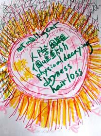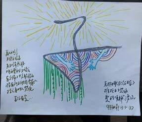 我特別沉浸的是在藝術創作的這大約15~20分引導創作,本身沒有用畫筆在平面紙上學習,作畫時 有著我在經歷耶穌路上所有一切記憶圖片,還有我相信我是上帝獨特創造,就因為這基因,完成了我 的作品。(學員八)