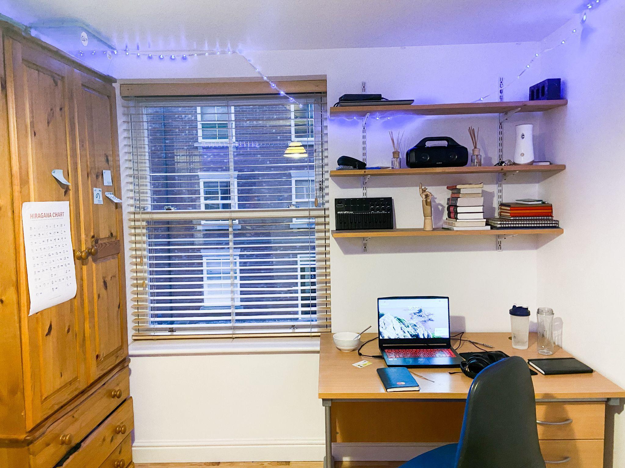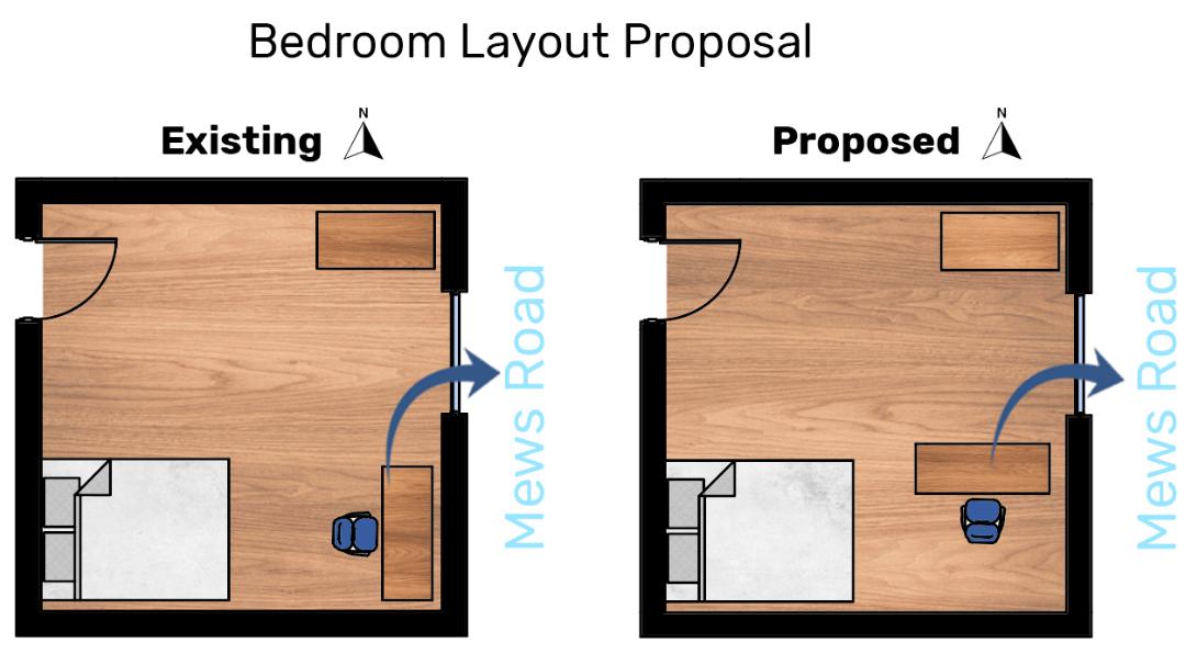 Thestudent'sroomisinaMewneighbourhood,andthewindowoverlookstheroadthatlinks totheparallelingsideofthemew.Althoughnotideal,thestudent'sroomprovidesdirect accesstothethree-wayintersectionacrossthestreet.