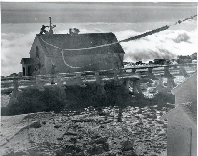 ABOVE: A weather observer takes readings atop the building that served as the Mount Washington Observatory’s winter home in its earliest years.