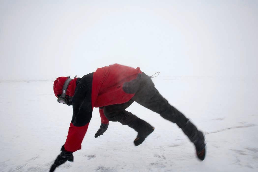 himself as usual for the northwesterlies, he found himself face-down in the snow. A southeasterly blast had upended him from behind. Stephenson recovered and, with great effort, climbed to the roof of the cabin with a wooden club he used to knock the anemometer free of ice. The moment he loosened his grip on his stick, the wind swept it away.